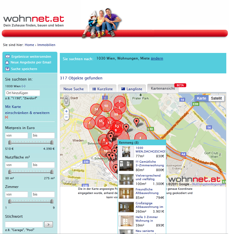 Über 300 freie Mietwohnungen ergibt zum Beispiel die Suche auf Wohnnet.at für den 3. Bezirk in Wien. Ob die Wohnung im Botschaftsviertel oder im Weissgerberviertel liegt, macht für den Wohnungssuchenden einen großen Unterschied. Durch die Geokodierung kann sich der User auf Wohnnet.at rasch einen Überblick verschaffen. Egal ob im Internet oder bei der mobilen Wohnungssuche mittels iPhone App, die Wohnnet.at-Angebote sind übersichtlich als rote Kreise im Wiener Stadtplan eingezeichnet.