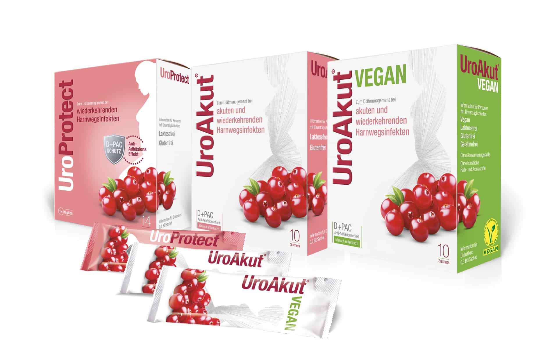 UroProtect, UroAkut® und UroAkut® vegan für eine gesunde Blase.