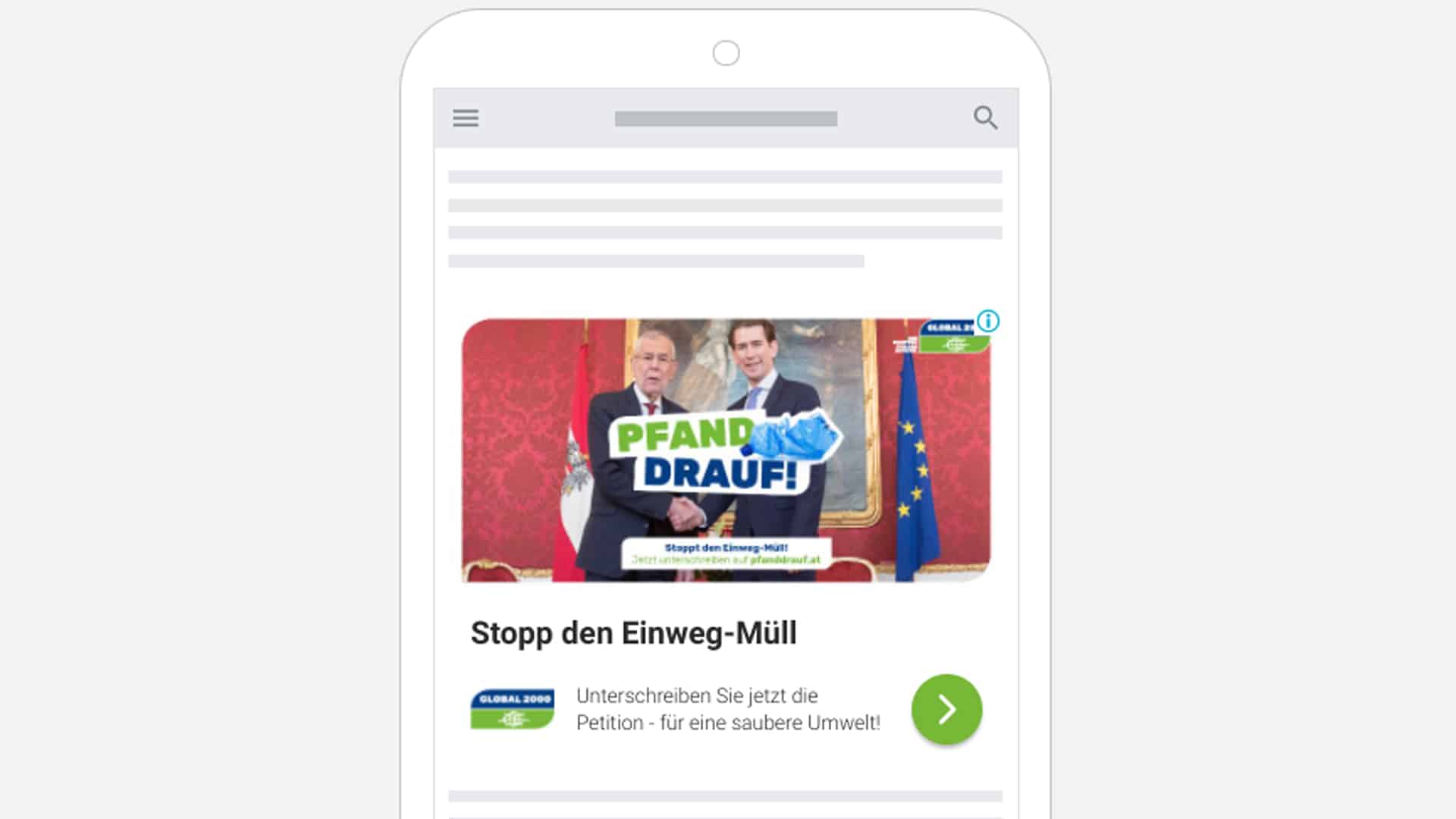 “Unser Ziel bei dieser Kampagne war es, neue Personen anzusprechen, die wir nicht über unsere bisherigen Online- und Offline-Kanäle erreichen konnten und diese für die “Pfand Drauf”-Petition zu gewinnen”, sagt Katharina Hölzl, Online Fundraising bei GLOBAL 2000. Basierend auf diesem Ziel konzipierte das SEA-Team von e-dialog eine Kampagne, welche sowohl responsive Google Display Ads als auch Youtube-Anzeigen inkludierte.