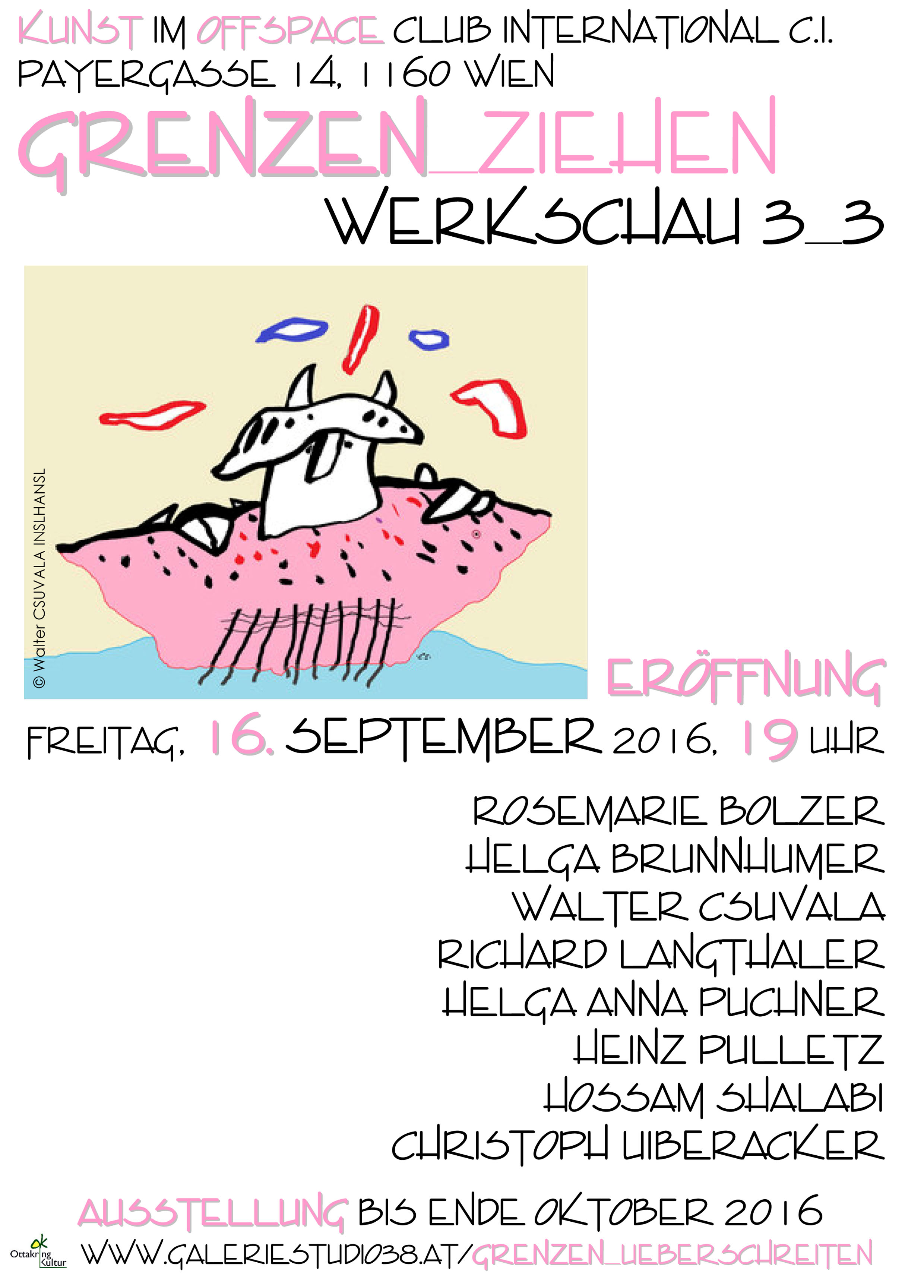 Am 16. September wird im Ottakringer OFFSPACE Club International C.I. die dritte und letzte von drei Gruppenausstellungen zum Jahresthema 2016 „Grenzen überschreiten… in Bewegung sein“, eröffnet. An der dritten Werkschau sind 8 international tätige Künstlerinnen und Künstler beteiligt – mit Malerei, Zeichnung, C-Prints, Holzschnitten und Fotokunst. Erstmals wird das gesamte Ausstellungsprojekt in Form eines Kataloges dokumentiert.