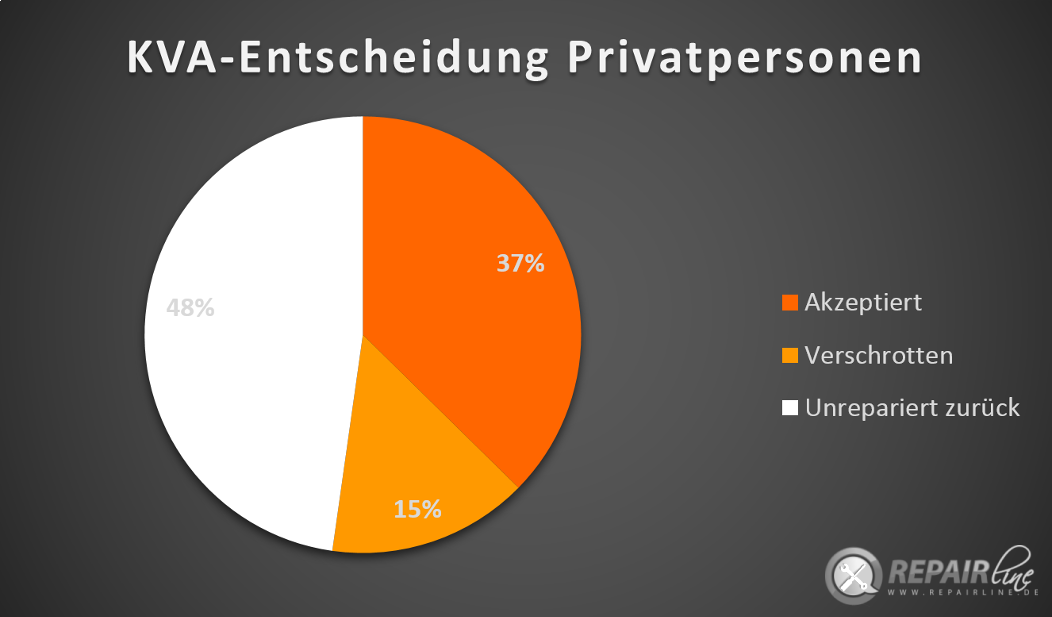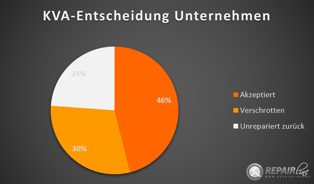 In Antwort auf den Kostenvoranschlag gaben etwa vier von zehn Kunden die Reparatur in Auftrag, während sich nur jeder Sechste für die Verschrottung des Gerätes entschied. Dabei waren bei der untersuchten Probe klare Unterschiede in den Entscheidungen von Geschäfts- und Privatkunden zusehen. Privatpersonen entschieden sich doppelt so oft wie Unternehmen, auf die Reparatur zu verzichten und ihr Gerät zurückzuverlangen. Unternehmen dagegen haben zweimal so oft im Vergleich zu Privatnutzern das Gerät verschrotten lassen. Auffällig ist außerdem, dass Geschäftskunden deutlich häufiger bereit waren die Kosten der Reparatur zu tragen. So haben Unternehmen beinahe jeden zweiten Kostenvoranschlag angenommen, während nur drei von acht Privatpersonen sich für die kostenpflichtige Reparatur entschieden haben.