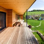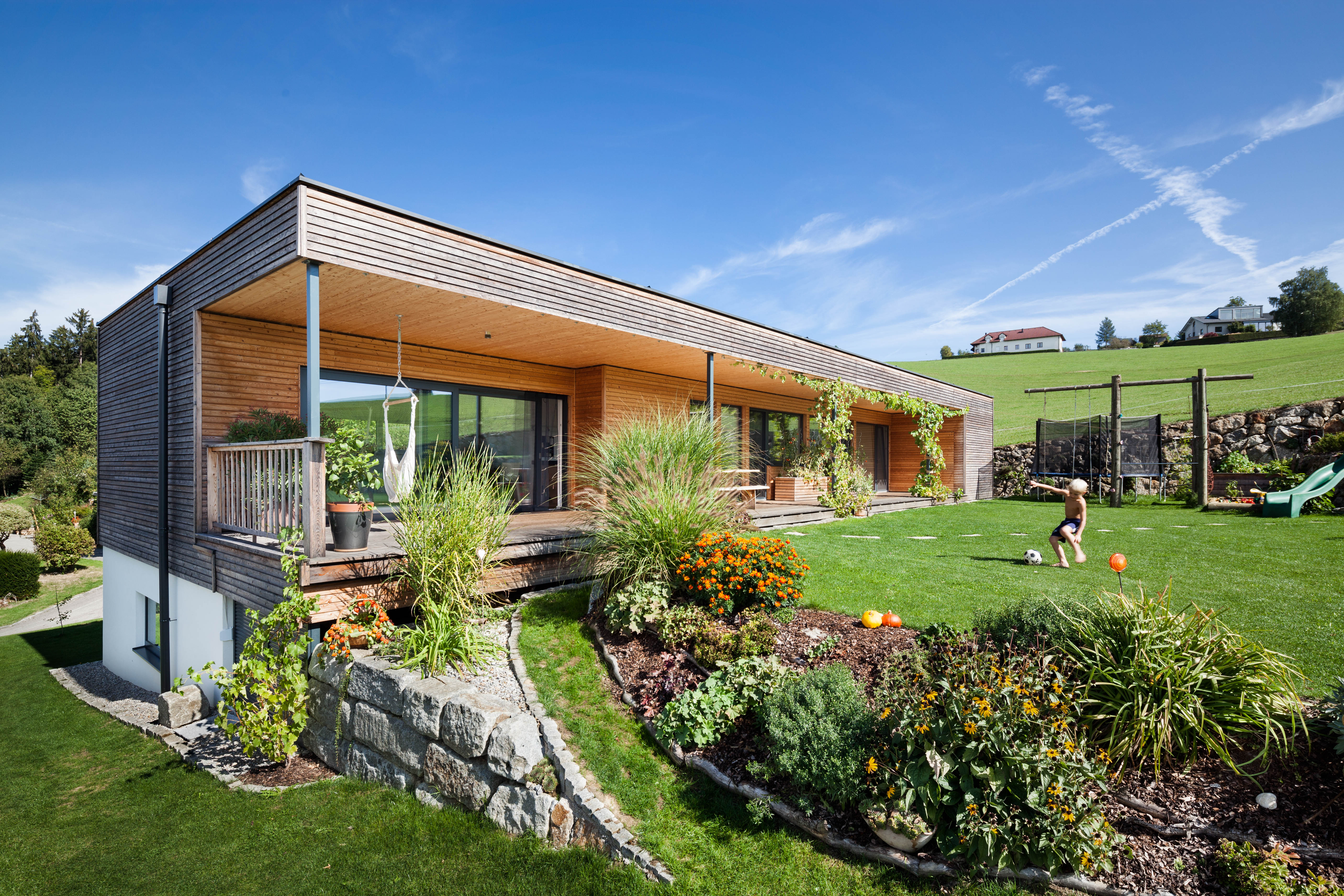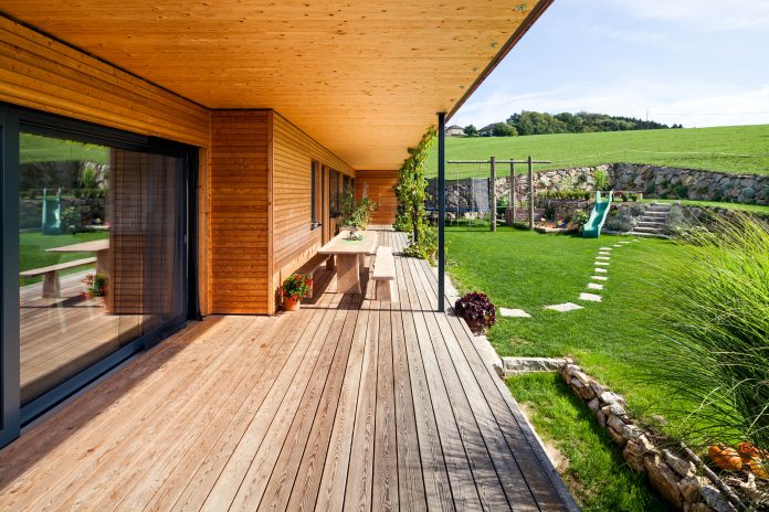 Sichtbares Holz ist bei diesem, von Markus Obergottsberger (transformatorGESCHICHTEN Ager Obergottsberger Architektur GmbH) geplanten Objekt, das dominierende Gestaltungselement. Die komplette Außenfassade wurde bis zum Flachdach hin mit Lärchenholz ausgeführt, ebenso wie der überdachte, südseitig gelegene Terrassengang. Der Übergang vom Wohnbereich zum Garten wird so natürlich beschattet und bildet einen witterungsunabhängigen Freibereich. Auch die angenehme Raumatmosphäre im Haus wird durch großflächigen Holzeinsatz gefördert– eine sichtbare Massivholzdecke spannt sich über den gesamten Wohnbereich, die Böden bestehen aus Naturholzdielen.