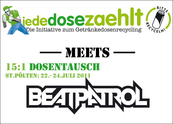 Am Campinggelände von Beatpatrol werden wertvolle Getränkedosen ausgetrunken, geCRUSHt, gezählt und getauscht - und recycelt: „15 zu 1“ lautet erstmals die Dosentausch-Parole auf dem diesjährigen Beatpatrol Festival in St.Pölten vom 22. bis 24. Juli 2011, eine Kooperation der Umweltinitiative Greenpatrol und "jede Dose zählt".