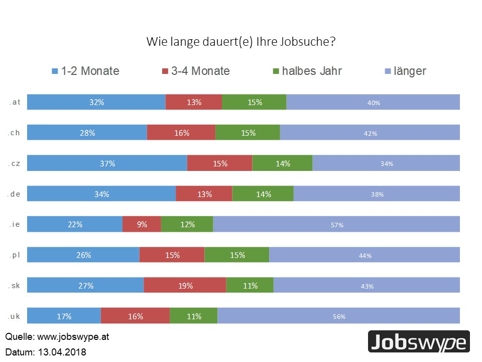 Ein Monat, ein Quartal, ein halbes Jahr oder mehr? Die Jobsuchmaschine Jobswype wollte von ihren Usern in der jüngsten Umfrage in acht europäischen Ländern wissen, wie lange deren Jobsuche dauert. Zwischen einem Drittel und der Hälfte der Befragten gibt an, länger als sechs Monate zu benötigen, um eine neue eine Arbeitsstelle zu finden.
