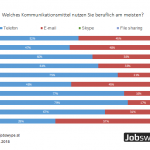 Alkohol, Sport, Fernsehen oder Freunde treffen – auf alle diese Dinge könnten Österreicher laut Marketagent-Umfrage eher verzichten, als auf das Handy. Was für die Freizeit stimmt, muss sich nicht unbedingt im Arbeitsleben wiederspiegeln. Bei der Fülle an neuen Kommunikationsmitteln, die am Arbeitsplatz zur Verfügung stehen, stellt sich die Frage, wie es um die „Klassiker“ steht. Die neueste Umfrage der Jobsuchmaschine Jobswype wollte von ihren europäischen Usern daher wissen: „Welches Kommunikationsmittel nutzen Sie beruflich am meisten?“ Sind es noch immer Telefon und E-Mail oder haben sich modernere Varianten wie Skype oder Filesharing großflächig durchgesetzt?