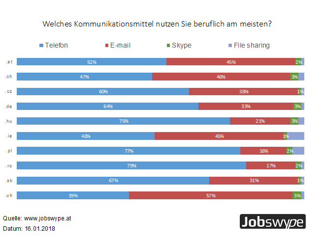 Zwischen 39 (Vereinigtes Königreich) und 79 Prozent (Rumänien) der europäischen Arbeitnehmer verlassen sich für ihre berufliche Kommunikation auf das gute alte Telefon, während zwischen 17 (Rumänien) und 57 Prozent (Vereinigtes Königreich) auf die E-Mail setzen. Insgesamt zeichnet sich auf europäischer Ebene, laut Zahlen der Jobswype-Umfrage vom März 2018, ein klares Bild ab: Telefon und E-Mail teilen sich die Gunst der Nutzer, während Skype und Filesharing auf Werte kommen, die zwischen 1 und 6 Prozent liegen. In Österreich sieht die Verteilung, wie folgt aus: Telefon (52 Prozent), E-Mail (45 Prozent), Skype (2 Prozent), Filesharing (1 Prozent).