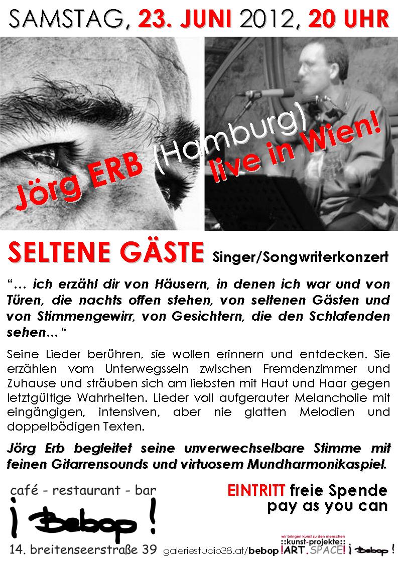 Samstag, 23. Juni 2012, 20 Uhr: Jörg ERB (Hamburg) live in Wien! SELTENE GÄSTE Singer/Songwriterkonzert Cafe - Restaurant - Bar i bebop! Breitenseer Straße 39, 1140 Wien - Eintritt: freie Spende/pay as you can.