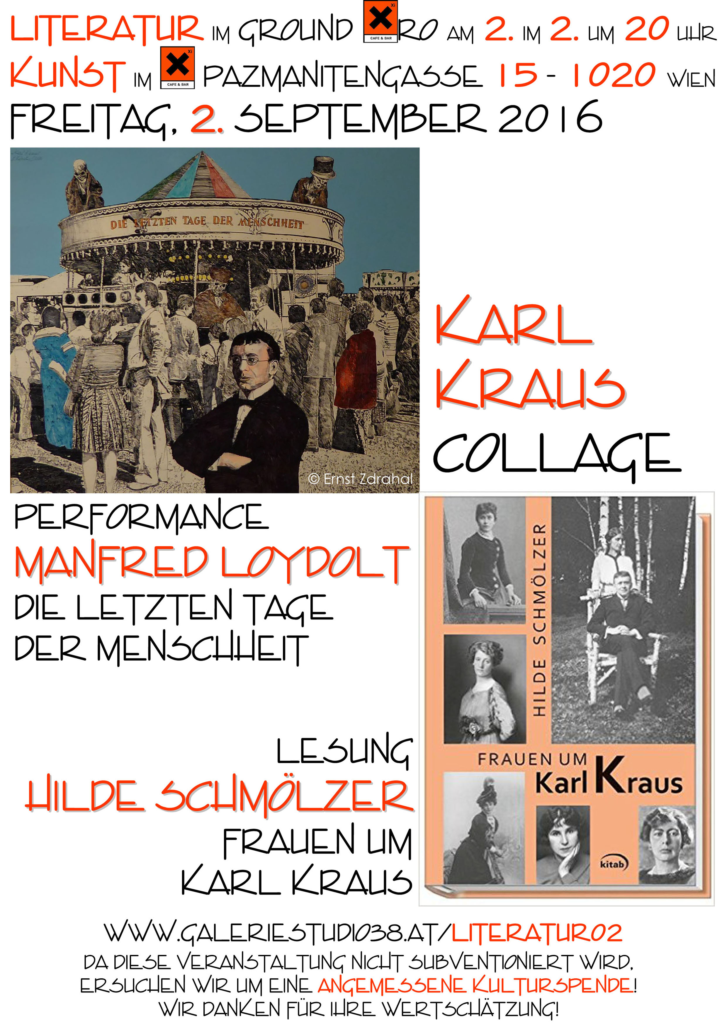 Performance Manfred LOYDOLT „Die letzten Tage der Menschheit“ Lesung Hilde SCHMÖLZER „Frauen um Karl Kraus“ Freitag, 2. September 2016, 20 Uhr Xi CAFE & BAR Pazmanitengasse 15, 1020 Wien