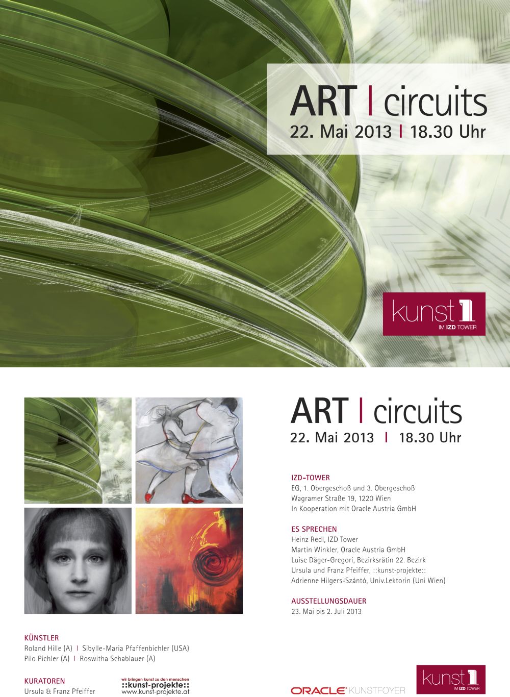 ART I circuits Roland HILLE (A), Sibylle-Maria PFAFFENBICHLER (USA), Pilo PICHLER (A) Roswitha SCHABLAUER (A), Kuratiert von kunst-projekte Vernissage Mittwoch 22. Mai 2013, 18.30 Uhr IZD-Tower Wagramer Straße 19, 1220 Wien In Kooperation mit Oracle Austria GmbH und BHR