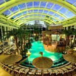 Die Dekorationsbeleuchtung rückt die eindrucksvolle Stahl-Glaskonstruktion ins Licht, bringt die Raumhöhe von 14 Metern zur Geltung und verleiht der Cabrio-Therme eine angenehme Raumtiefe.