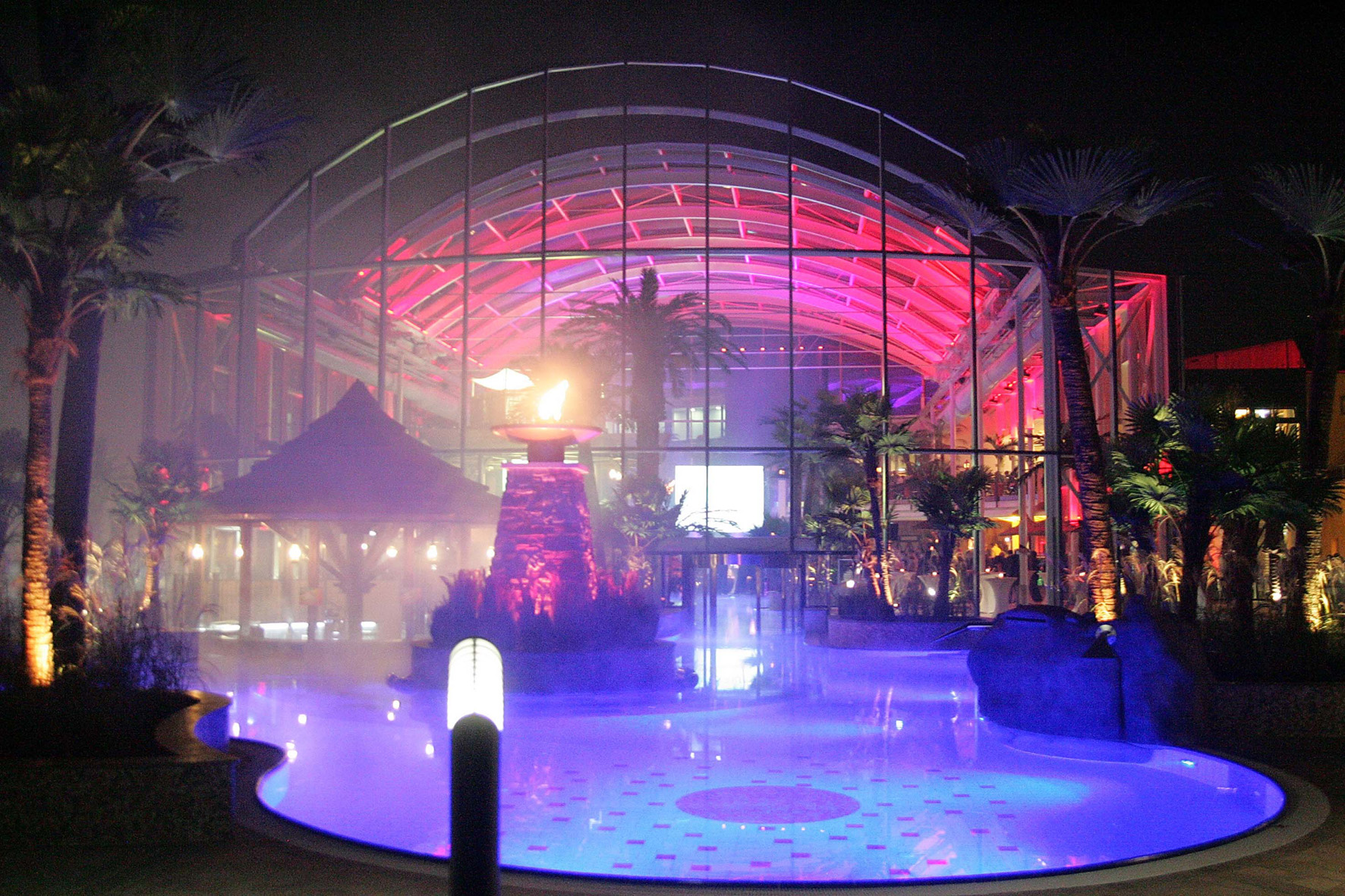 Die Dekorationsbeleuchtung rückt die eindrucksvolle Stahl-Glaskonstruktion ins Licht, bringt die Raumhöhe von 14 Metern zur Geltung und verleiht der Cabrio-Therme eine angenehme Raumtiefe.