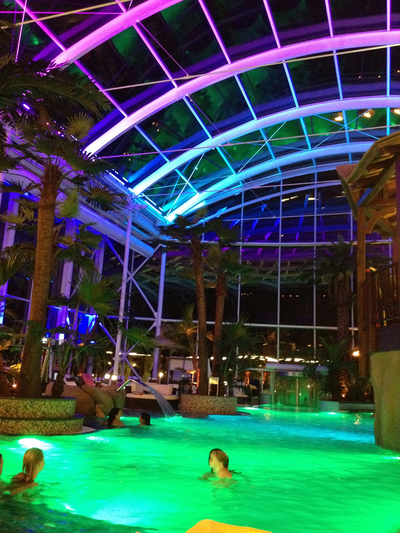 Neben der Architektur sind auch die Wasserflächen, Palmen sowie Outdoorflächen im Lichtkonzept integriert. So können unterschiedliche Stimmungsbilder durch die Beleuchtung der einzelnen Elemente erzeugt werden. Beispielsweise erstrahlt das Wasser in Türkis, die Dachkonstruktion – also der Himmel – in Violett und die Palmen in Gelb. Im 10-Minuten-Intervall wechseln die Farben und ein neues Stimmungsbild inszeniert die Cabrio-Therme.