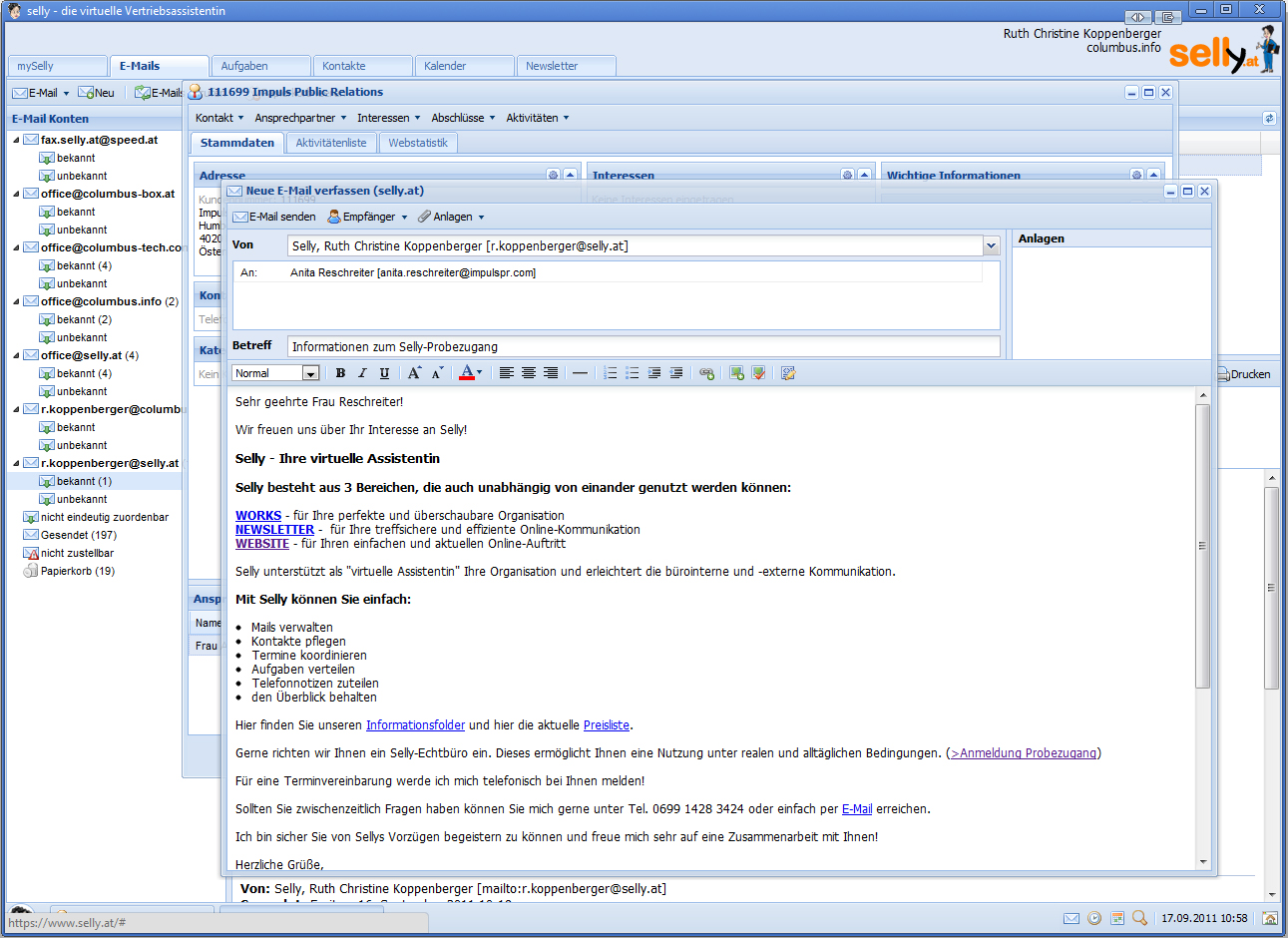 Word, Excel und Outlook, das sind meist die Programme, mit denen Mitarbeiter in KMUs vertraut sind. Der tägliche Arbeitsablauf sieht vielfach so aus, dass Kontaktdaten in verschiedenen Listen oder gar nur im Handy gespeichert sind, die Aufgaben für nächste Woche der Chef alleine im Kopf hat und Antwortmails auf Kundenanfragen jedes Mal wieder neu geschrieben werden. Das Optimierungspotenzial durch IT-Unterstützung liegt klar auf der Hand. Was für große Unternehmen SAP oder andere ERP-Systeme leisten, bietet Selly für kleine und mittelgroße Unternehmen, kostengünstig und mit allen Funktionen, die ein KMU braucht.