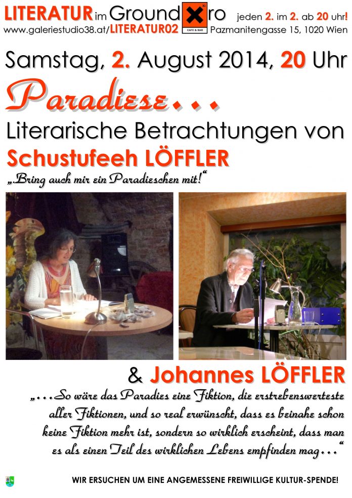 Am 2. August lesen Schustufeeh Löffler und Johannes Löffler aus ihren Texten. Im Fokus ihrer literarischen Betrachtungen stehen „Paradiese“. Beide haben bereits im Rahmen von kunst-projekte gelesen. Nun bestreiten sie erstmals einen gemeinsamen Leseabend.