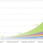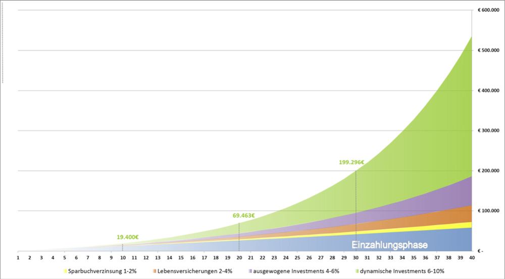 In der Darstellung werden realistische Beispiele berechnet, mit einer durchschnittlichen Verzinsung pro Jahr und einem Einzahlungsbetrag von 100,– Euro pro Monat. Wenn die Ansparzeit 40 Jahre beträgt, werden 48.000,– Euro investiert. Das Ergebnis bei einer 2%igen Verzinsung, mit beispielsweise einem Sparbuch, liegt bei 72.534,– Euro. Entscheidet man sich für eine ausgewogene Sparform, die je zu 50% aus Qualitätsanleihen und ETFs besteht, werden bei einer 6%igen Wertsteigerung 186.413,– Euro für die Zusatzpension erwirtschaftet. Wer risikobereiter in dynamische Ansparformen, wie in breit gestreute Aktien von bewährten undrenommierten Unternehmen, investiert, kann sogar mit 536.048,– Euro am Endeder Laufzeit rechnen, was einer angenommenen Wertsteigerung von jährlich 10%entspricht