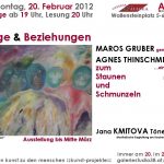 Die aus Italien stammende Malerin Maros Gruber und die Brigittenauer Dichterin Agnes Thinschmidt kennen einander vom Theaterspielen bei einer Laienspielgruppe. Nun treten sie erstmals bei der Reihe „bilder.worte.töne“ in „Beziehungen“, dem Jahresthema der Reihe entsprechend. Inspiriert von Maros Grubers Werken hat Agnes Thinschmidt Gedichte verfasst, die sie im Rahmen der Vernissage vortragen wird. Ergänzt wird ihre Lesung durch heitere und humorvolle Mundartgedichte zum Faschingsausklang und Lyrik aus ihrer Feder, musikalisch begleitet von Jana Kmitova am Keybord.