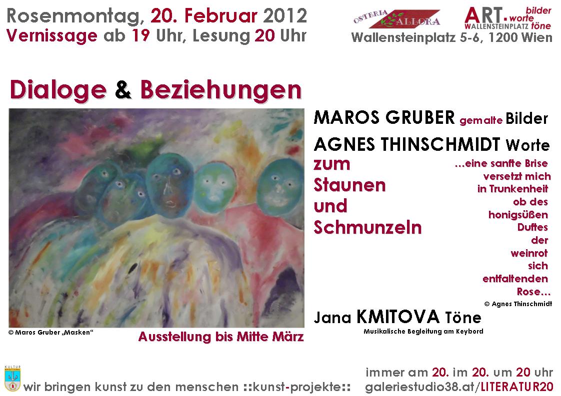 Die aus Italien stammende Malerin Maros Gruber und die Brigittenauer Dichterin Agnes Thinschmidt kennen einander vom Theaterspielen bei einer Laienspielgruppe. Nun treten sie erstmals bei der Reihe „bilder.worte.töne“ in „Beziehungen“, dem Jahresthema der Reihe entsprechend. Inspiriert von Maros Grubers Werken hat Agnes Thinschmidt Gedichte verfasst, die sie im Rahmen der Vernissage vortragen wird. Ergänzt wird ihre Lesung durch heitere und humorvolle Mundartgedichte zum Faschingsausklang und Lyrik aus ihrer Feder, musikalisch begleitet von Jana Kmitova am Keybord.