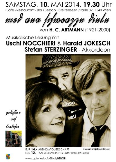 Uschi Nocchieri (Clown und Schauspielerin) und Harald Jokesch (Schauspieler und Regisseur) holen die „schwoazze dintn“ mit all ihren schaurig-schönen Abgründen aus dem Bücherregal auf die Lesebühne des Breitenseer Szenelokals i Bebop ! (indessen unmittelbarer Nähe H. C. Artmann aufgewachsen ist).