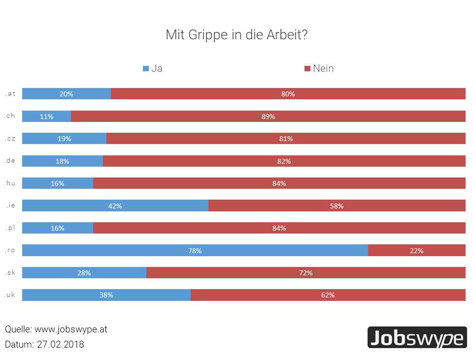 Jobswype-Umfrage: Österreich mitten in der heurigen Influenza-Saison – laut offiziellen Daten hat diese rund um den Jahreswechsel eingesetzt. Doch nicht nur die echte Grippe, sondern auch grippale Infekte, also Erkältungen allgemein, befinden sich in der kalten Jahreszeit auf dem Vormarsch. Für Angestellte und Betriebe bedeutet dies einen Anstieg der Krankmeldungen. Die Jobsuchmaschine Jobswype befragte daher ihre europäischen User, ob sie trotz Grippe weiterhin in die Arbeit gehen würden. Krankenbett und Erholung oder Schreibtisch und Arbeitsstress?