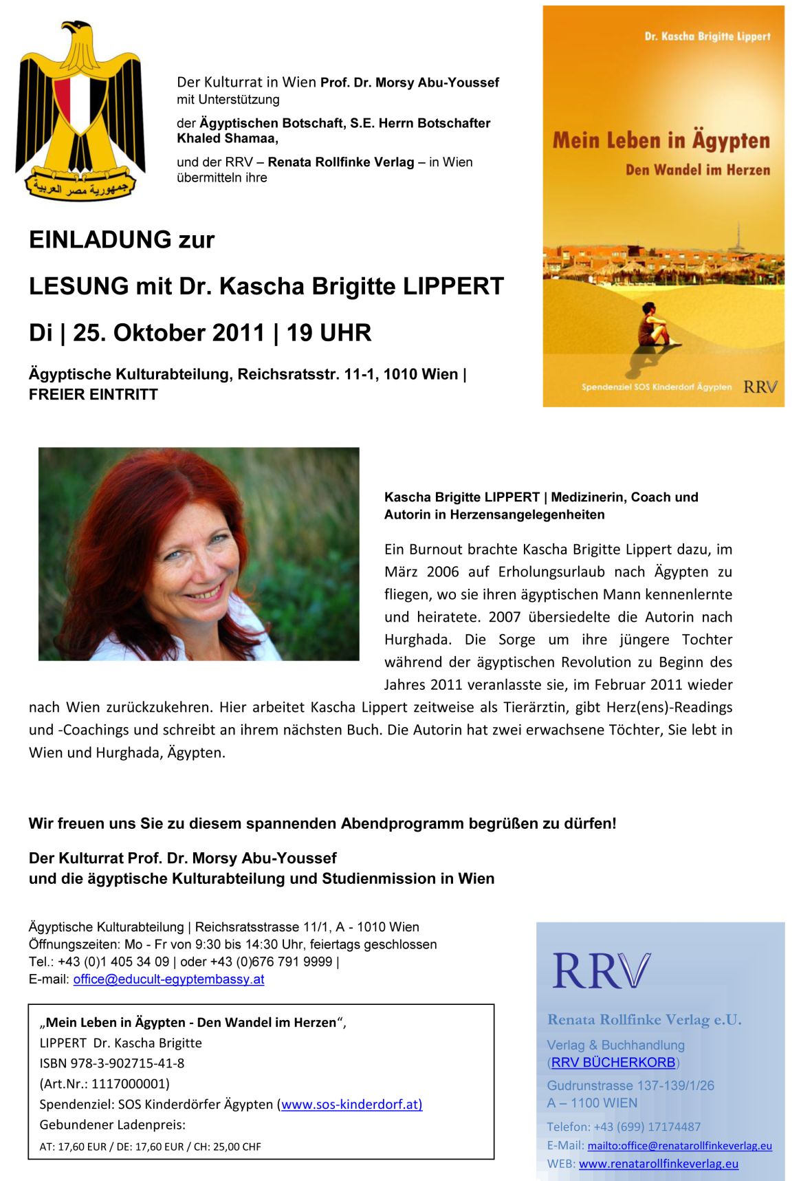 Ein Burnout brachte Kascha Brigitte Lippert dazu, im März 2006 auf Erholungsurlaub nach Ägypten zu fliegen, wo sie ihren ägyptischen Mann kennenlernte und heiratete. 2007 übersiedelte die Autorin nach Hurghada. Die Sorge um ihre jüngere Tochter während der ägyptischen Revolution zu Beginn des Jahres 2011 veranlasste sie, im Februar 2011 wieder nach Wien zurückzukehren. Hier arbeitet Kascha Lippert zeitweise als Tierärztin, gibt Herz(ens)-Readings und -Coachings und schreibt an ihrem nächsten Buch. Die Autorin hat zwei erwachsene Töchter. Sie lebt in Wien und Hurghada, Ägypten.