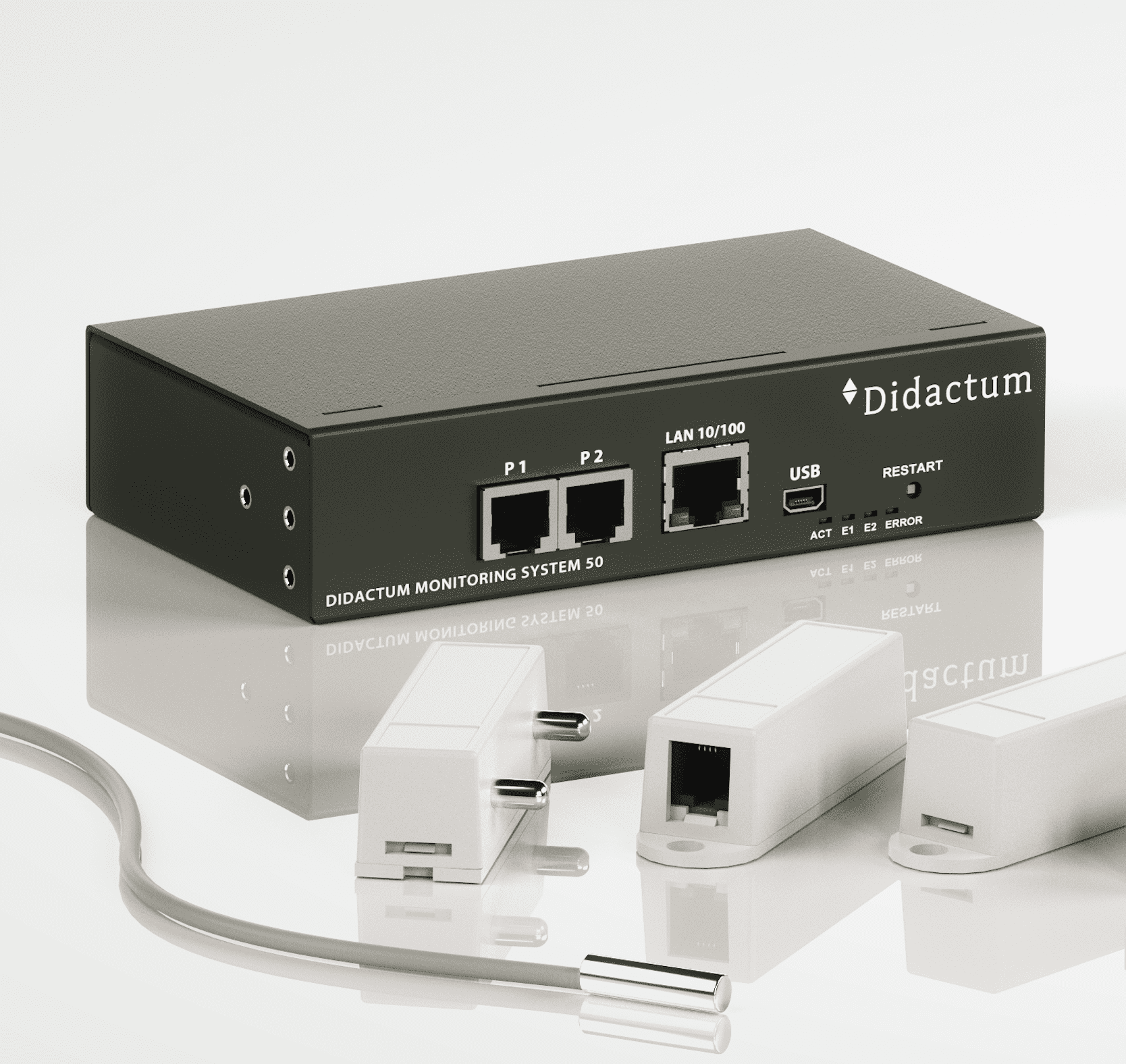 Das Didactum Monitoring System 100 ist ein Mess- und Überwachungsgerät für die Überwachung der Temperatur und weiterer Umgebungs- sowie Sicherheitsfaktoren. Ein Sensor für die Temperaturmessung ist bereits Bestandteil dieses IP-Thermometers. Die gemessenen Daten werden im integrierten Datenlogger des Gerätes gespeichert und können in Form von Diagrammen und Messkurven grafisch angezeigt werden. Diese Daten können als CSV- oder XML-Datei heruntergeladen und mit Tools zur Datenvisualisierung oder Tabellenkalkulationsprogrammen aufbereitet werden.