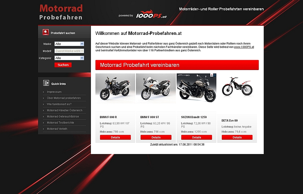 Die Seite www.motorrad-probefahren.at ist eine Initiative des Unternehmens 1000PS Internet GmbH. Das Wiener Neustädter Unternehmen betreibt unter www.1000ps.at Österreichs größten Marktplatz für Neu- und Gebrauchtmotorräder und zählt 98% aller österreichischen Motorradhändlern zum Kundenkreis.