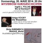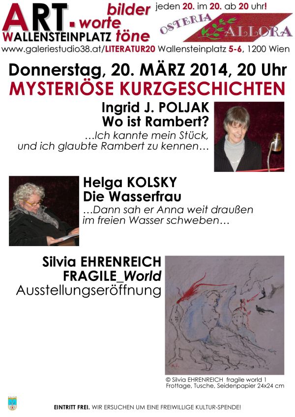 bilder.worte.töne MYSTERIÖSE KURZGESCHICHTEN Ingrid J. POLJAK Wo ist Rambert? Helga KOLSKY Die Wasserfrau Silvia EHRENREICH FRAGILE_World Ausstellungseröffnung Donnerstag, 20. MÄRZ 2014, 20 Uhr Osteria Allora art.wallensteinplatz Wallensteinplatz 5-6, 1200 Wien