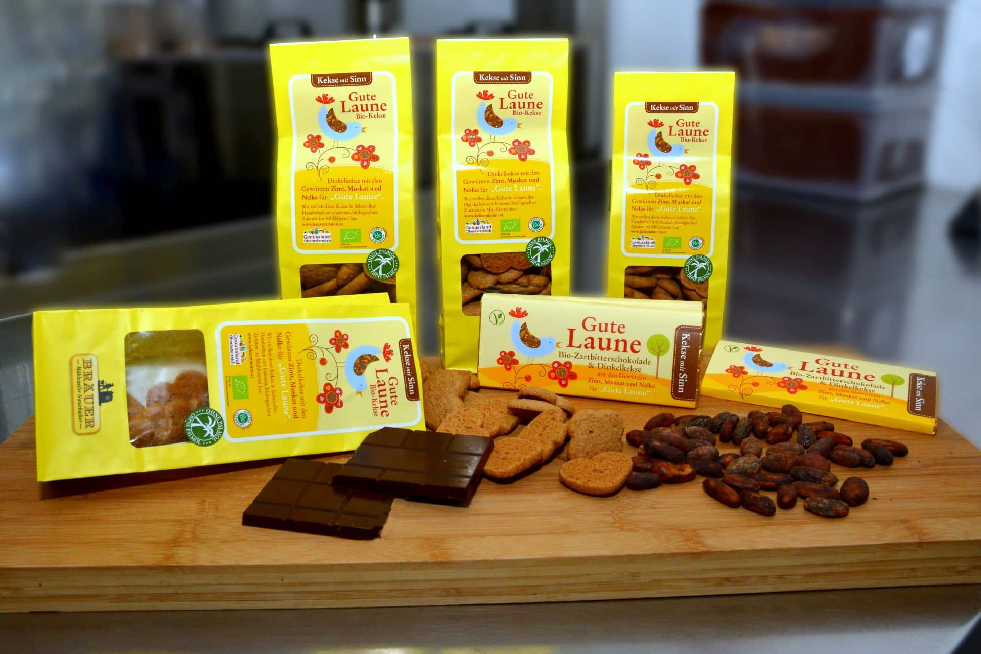 Mit sieben Sorten Bio-Dinkel-Keksen ist der Mühlviertler Naturbäcker Martin Bräuer österreichweit im Handel vertreten. Jetzt findet sich die Philosophie von „Kekse mit Sinn“ auch in einer neuen Bio-Zartbitter-Schokolade wieder und das macht richtig gute Laune!