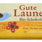 Die feine Zartbitterschokolade mit Dinkelkeksen, Zimt, Muskat und Nelken schmeckt wunderbar mild, ist nicht zu süß und kommt ohne tierische Inhaltsstoffe aus. Damit ist „Gute Laune Schokolade auch für Veganer ein Genuss.