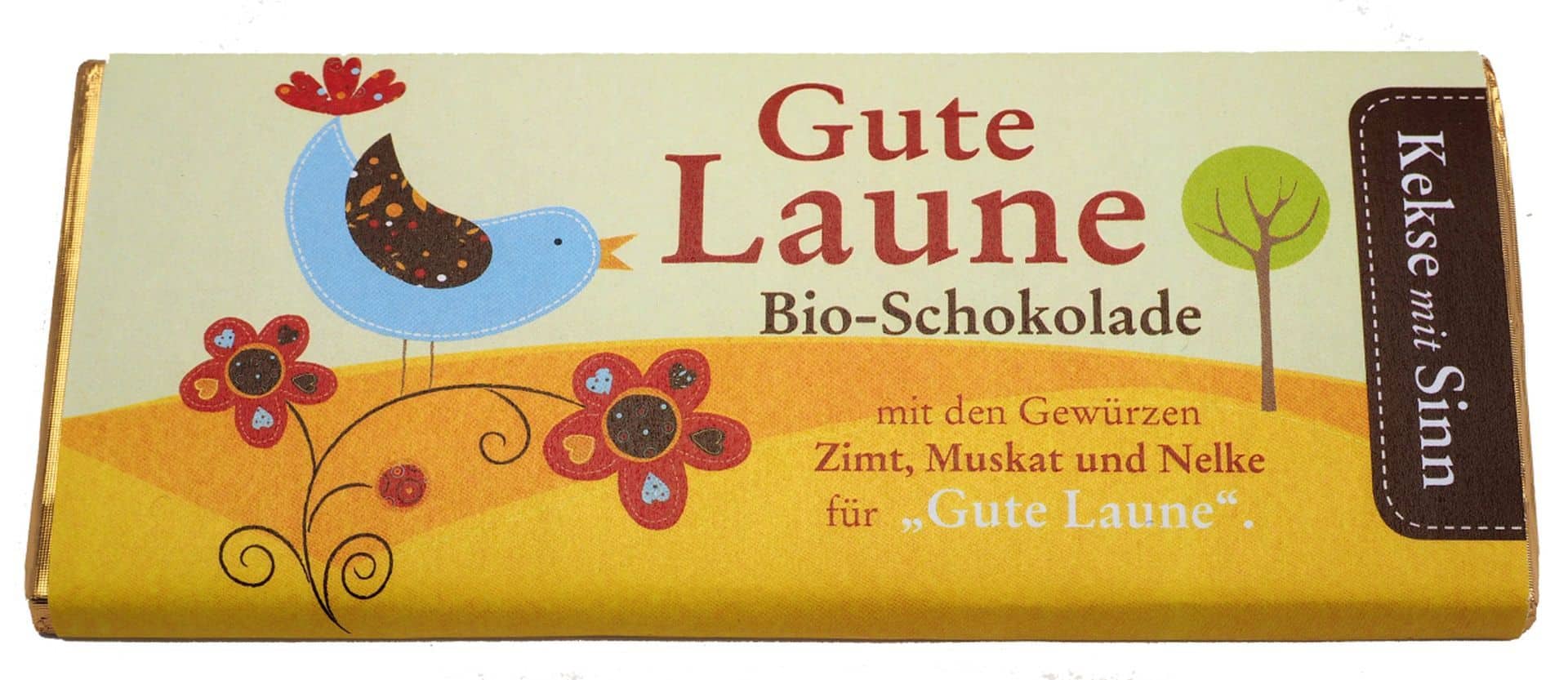 Zwar sind in einzelnen Kekse-mit-Sinn-Sorten auch Schokostückchen enthalten, aber jetzt gibt es auch ein Produkt, bei dem die Schokolade die Hauptrolle spielt: Die neue Zartbitterschokolade „Gute Laune“ von Martin Bräuer und Martin Mayer.