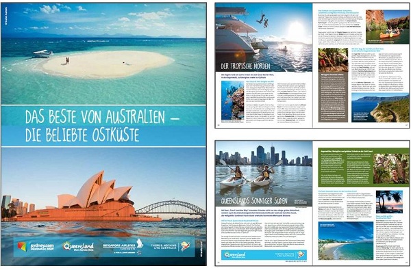 „Das Beste von Australien“ nennt sich die neue von „Tourism and Events Queensland“ und „Destination New South Wales“ herausgegebene Endverbraucher-Broschüre, die ausführlich die australische Ostküste vorstellt. Hier findet der Leser Informationen zu den wichtigsten Sehenswürdigkeiten entlang der „Legendary Pacific Coast“ von Cairns bis Sydney– sie gilt als der Klassiker unter den Selbstfahrerstrecken auf dem fünften Kontinent und ist vor allem bei Erstbesuchern sehr beliebt. Durch zahlreiche Bilder stellt der druckfrische Travel Guide die Faszination Queenslands und New South Wales‘ dar, beinhaltet aber gleichzeitig auch eine Vielzahl hilfreicher und informativer Berichte sowie eine Übersicht der wichtigsten Attraktionen und Regionen.