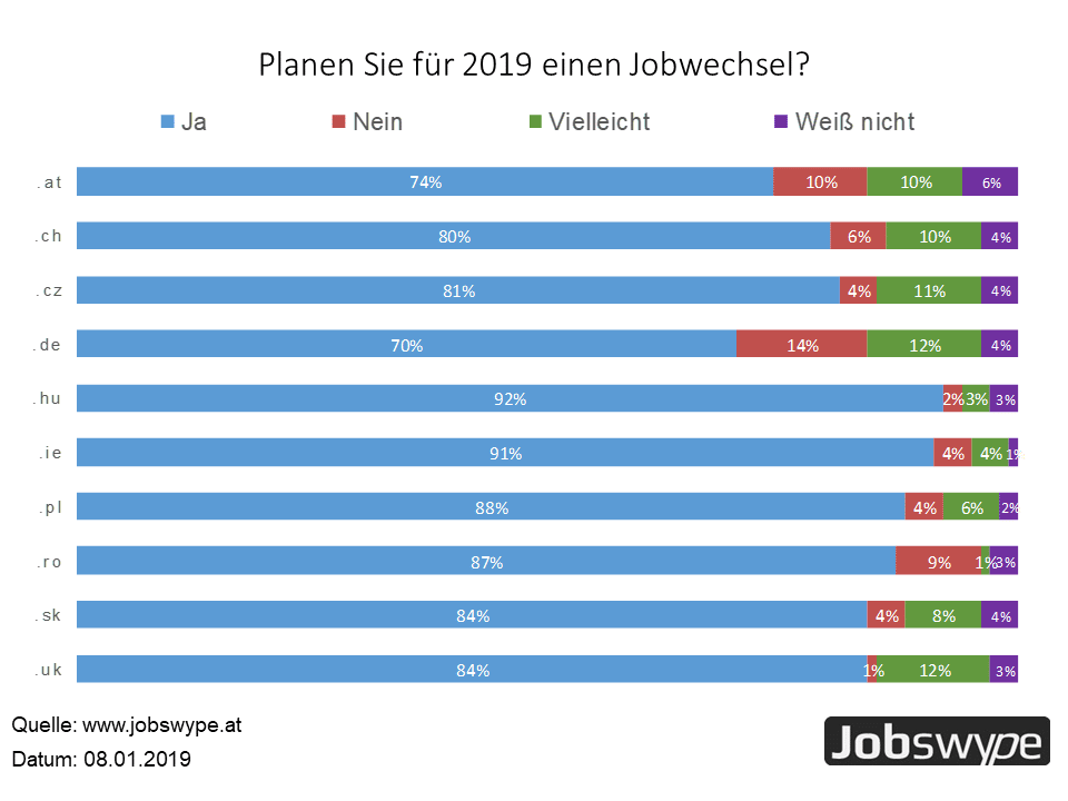 Europa im Umbruch: Vier von fünf europäischen Angestellten haben 2019 ein klares Karriereziel – einen neuen Job finden. Mit Werten zwischen 70 Prozent (Deutschland) und 92 Prozent (Ungarn) konnte die Antwort der Nutzer der Jobsuchmaschine Jobswype zum Jahreswechsel 2019, kaum eindeutiger ausfallen. Ähnlich hohe Werte auf die Frage „Planen Sie für 2019 einen Jobwechsel?“ wurden auch in Österreich, der Schweiz, Irland, Polen, Rumänien, Tschechien, Slowakei und im Vereinigten Königreich erreicht. Zählt man noch die Antwortmöglichkeit „vielleicht“ hinzu, erreichen fast alle Länder Werte über 80 Prozent – somit denkt fast jeder Berufstätige in Europa über einen Jobwechsel nach. Lediglich14 Prozent der User in Deutschland haben die Frage klar verneint.