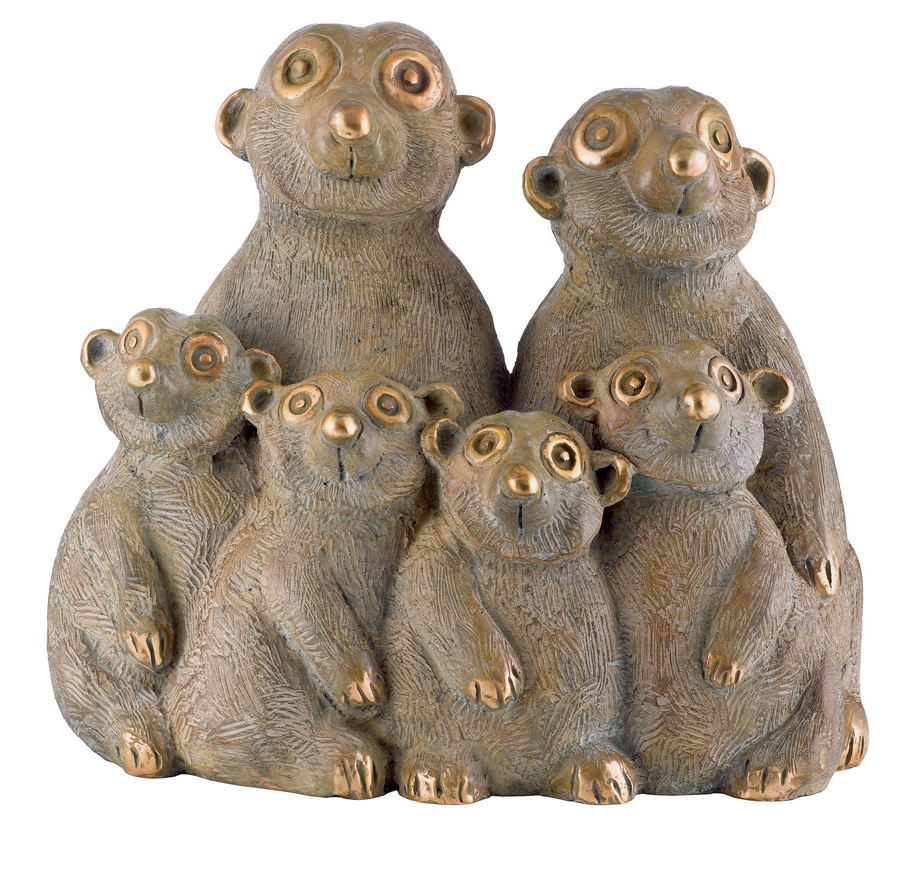 Da Erdmännchen traditionellerweise nicht allein vorkommen (sie haben ein ausgeprägtes Sozialverhalten und leben in Gruppen von vier bis neun Tieren), stellt auch Gottfried Kumpf diese Säugetiere in Form einer Familie dar. Die bezaubernde sechsköpfige Familie ist aus sandfarbig patinierter Bronze und bringt ganze 10 kg auf die Waage. Von der Erdmännchen-Familie sind 49 Stück exklusiv in der Dorotheum Galerie erhältlich. Mit einer Größe von ca. 33 cm ist die liebenswerte Familie für den Preis von € 4.890,- erhältlich.