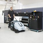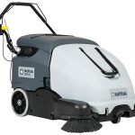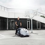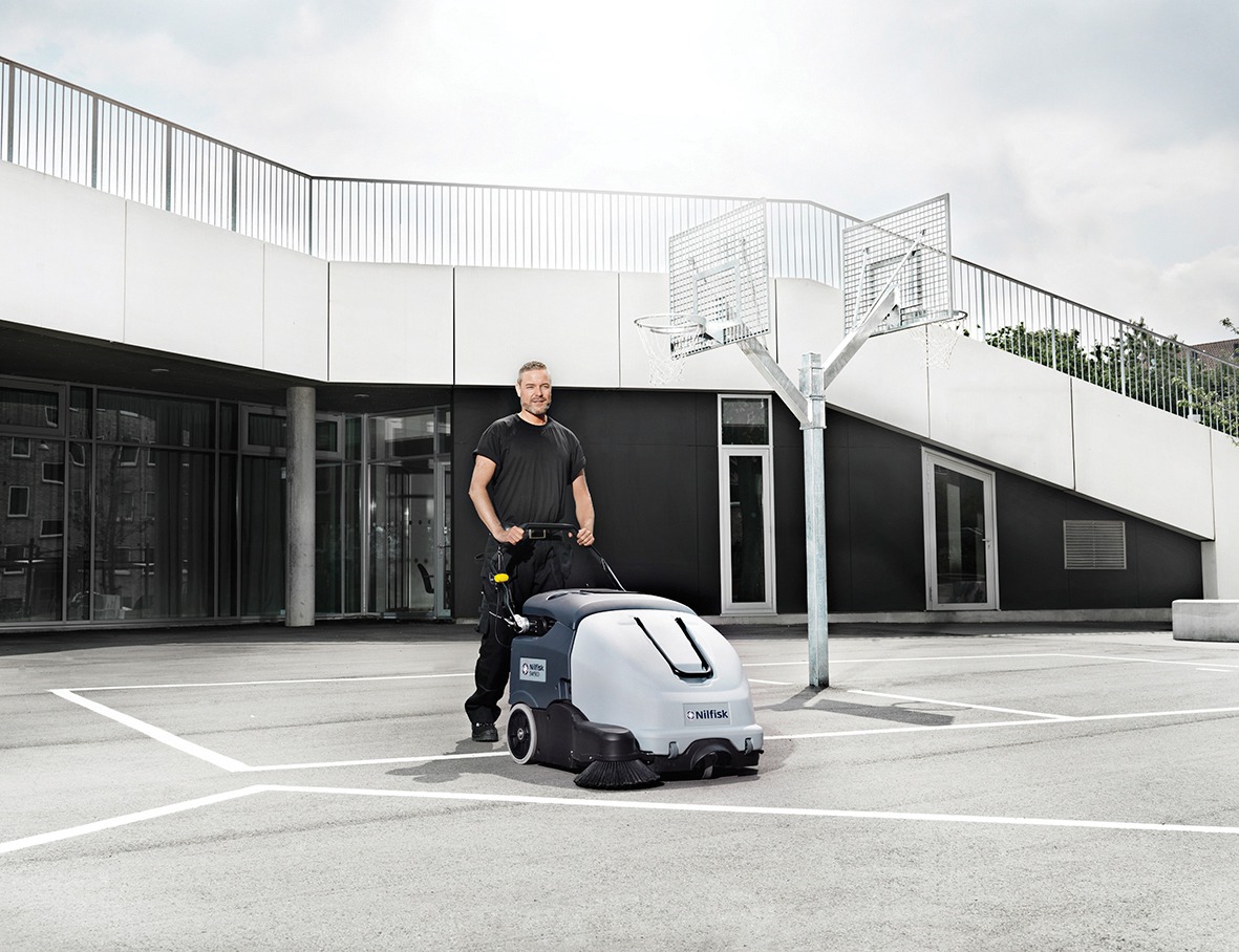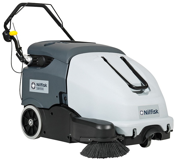 Neue Mitgänger-Kehrmaschine SW900 von Nilfisk professional, einsetzbar für Industrie- und Handelsflächen, Hotel und Schulen.