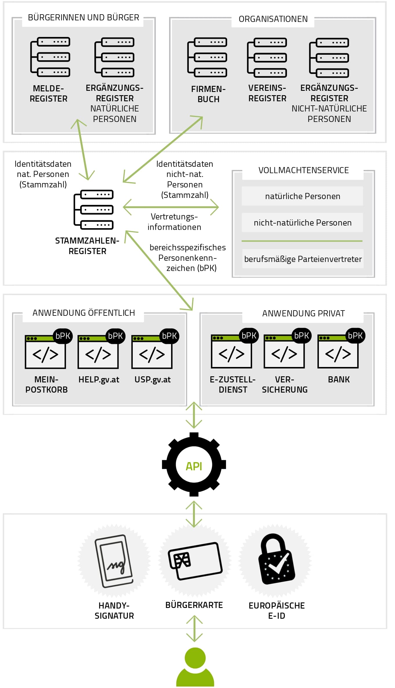 - Zudem dürfen die Daten aus den Registern nicht über Bereiche hinweg zusammengeführt werden. Daher können alle Daten zu einer Person jeweils nur von der Bürgerin und dem Bürger selbst mittels Bürgerkarte bzw. Handy-Signatur zusammengeführt werden.