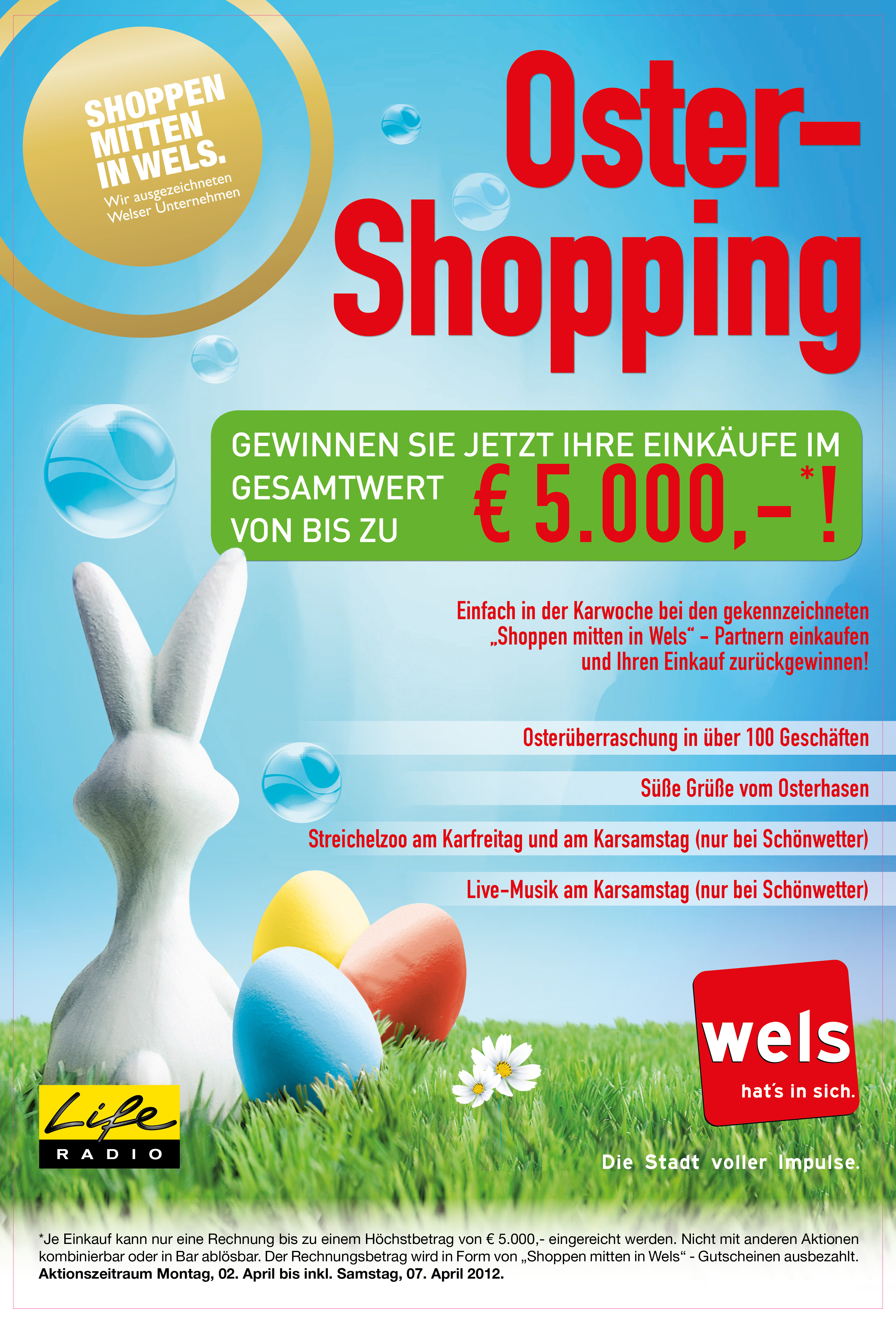 Shoppen in Wels lohnt sich immer. Aber in der Karwoche 2012 sogar noch ein bisschen mehr! Denn dank dem Osterhasen und der Wels Marketing & Touristik wird der eine oder andere sogar in seinem Geldtascherl sehen, wie sehr sich das Oster-Shopping 2012 im wahrsten Sinne des Wortes auszahlt - zum Beispiel mit bis zu 5.000 Euro!