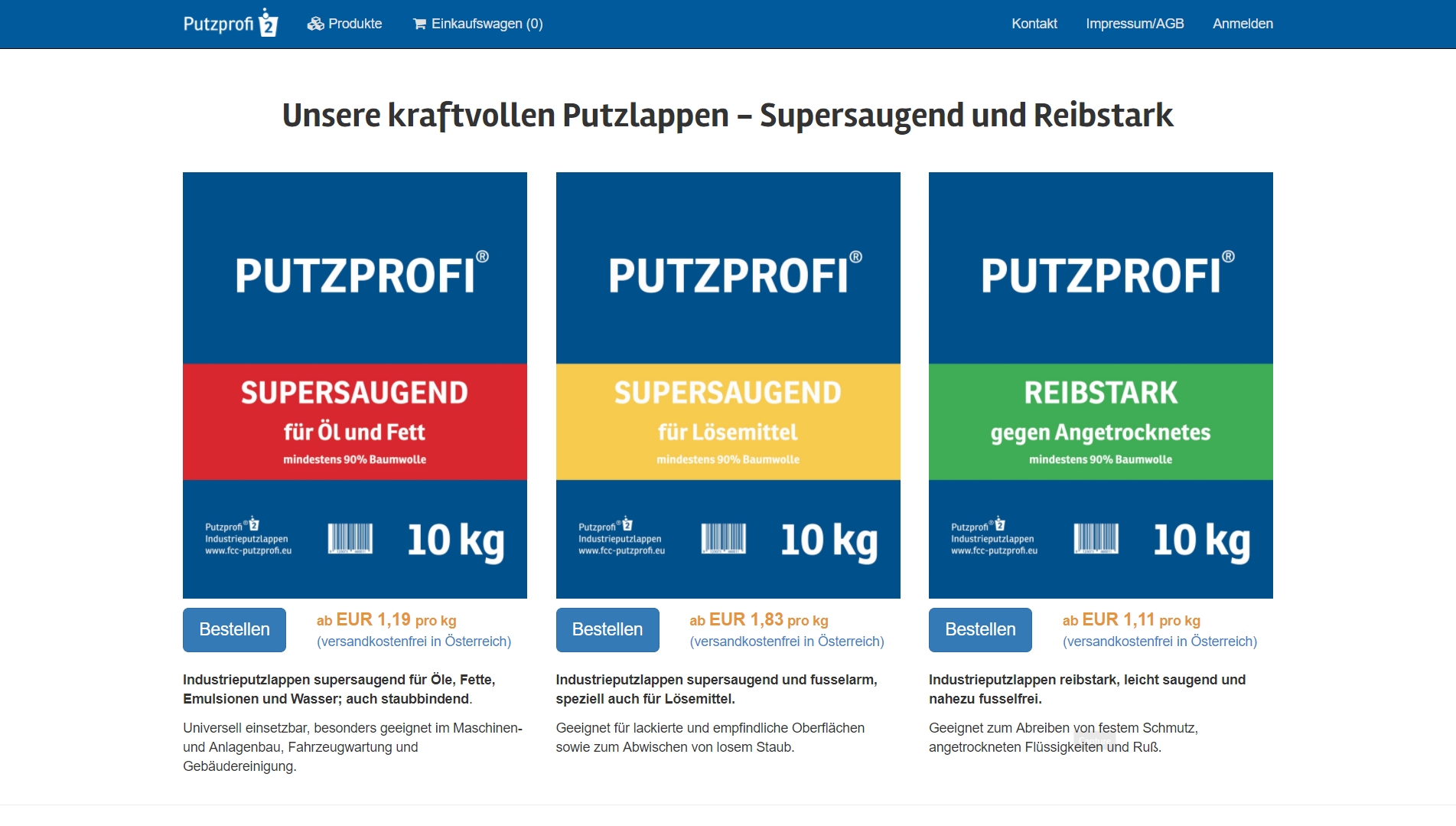Die Industrieputzlappen der „Putzprofis“ sind aus speziell sortierten, recycelten Textilien hergestellte, in handliche Stücke geschnittene Putzlappen. Sie bestehen zu mindestens 90 Prozent aus Baumwolle mit einer weichen, saugfähigen Gewebestruktur. Sie werden in den Varianten „Supersaugend für Öl und Fett“ (speziell für Werkstätten, Industrie- und Tankreinigung) „Supersaugend für Lösemittel“ (speziell für Maler, Tischler, Lackierer, Druckereien, Gebäudereiniger) und „Reibstark gegen Angetrocknetes“ (für alle Zielgruppen) angeboten. Es gibt sie im 10kg und 30kg Paket und als 360 kg-Palette.