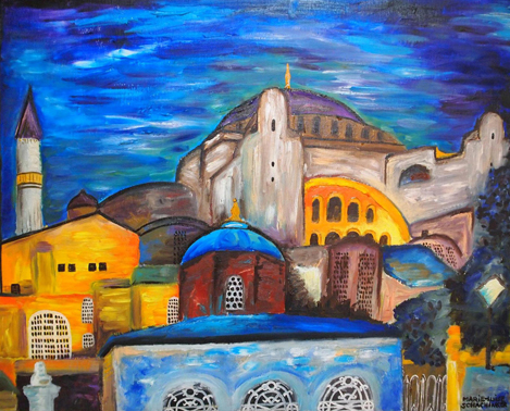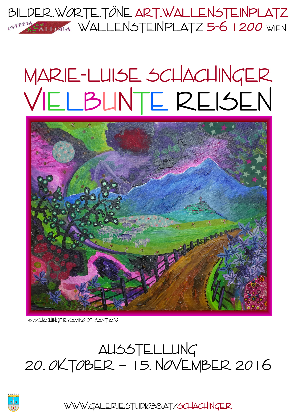 „Reisen“ bedeutet für Marie-Luise Schachinger,die Schönheiten in der näheren Umgebung zu erkunden, ohne auf andere Kontinente fliegen zu müssen. Diese Eindrücke hält sie dann in farbenfrohen Bildern fest. Unter dem Titel „Vielbunte Reisen“ präsentiert sie Malerei zu ihren eigenen Reiseerlebnissen, aber auch zu denen anderer. Die Schwerpunkte sind Impressionen von Spaziergängen in der Region am Faaker See in Kärnten und „Reisen mit den Augen" – Eindrücke von der Türkeireise ihrer Eltern.
