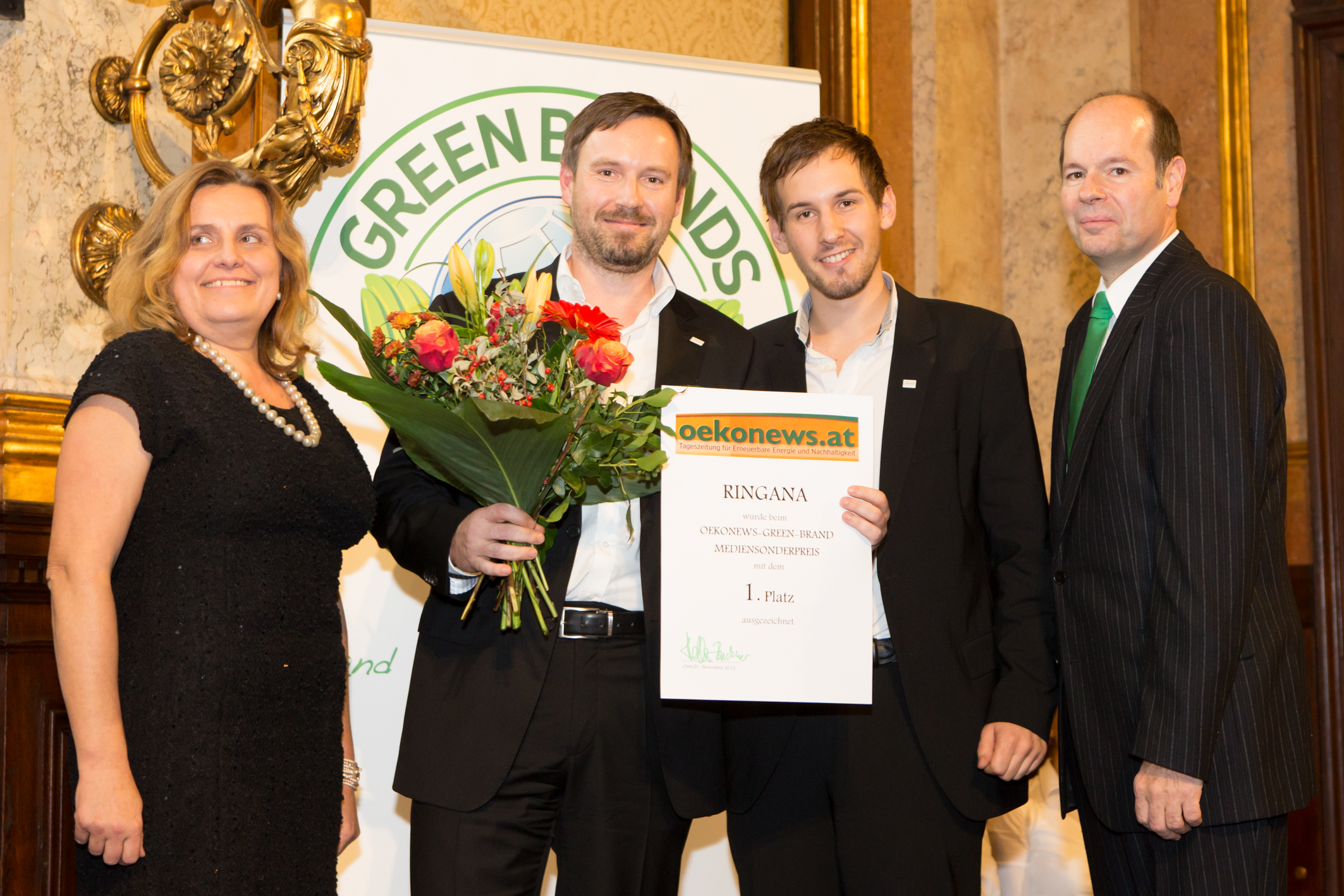 Die internationale, unabhängige und selbständige Brand-Marketing-Organisation GREEN BRANDS und das Medienportal OEKONEWS.at ehrten am vergangenen Montag, den 26.11.2012, bei der GREEN BRANDS GALA in Wien – zur Präsentation aller Green Brands Gütesiegel-Träger 2012/13 – RINGANA, den weltweit einzigen Hersteller von Frischekosmetik mit Sitz in der Steiermark, als Sieger des OEKONEWS-GREEN-BRAND Medien-Sonderpreises 2012. Mehr als 700 Facebook-User haben bei dem Online-Voting ihre Stimme abgegeben. Mit 37 % aller Stimmen geht Platz 1 an RINGANA.