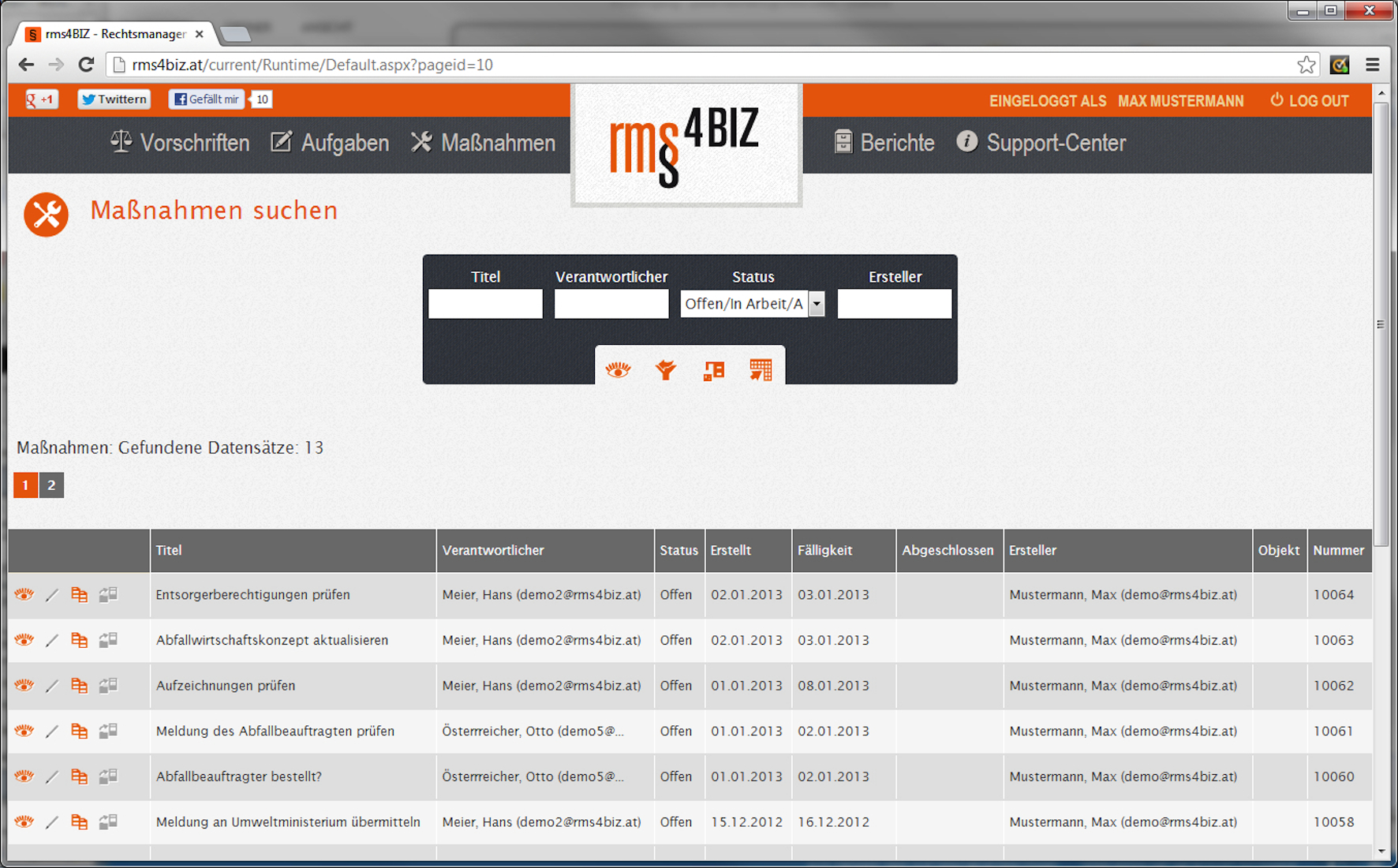 Im rms4BIZ-Portal sind die in der RIS-Datenbank verfügbaren Bundesgesetze hinterlegt. Diese können dank der übersichtlichen Suchfunktion rasch gefunden und mit einem Mausklick als unternehmensrelevant markiert werden. Änderungen der Gesetzestexte werden automatisch ins System übernommen und per E-Mail an die Verantwortlichen kommuniziert. Im nächsten Schritt lassen sich mit rms4BIZ aus den relevanten Gesetzen allgemein verständliche Aufgaben ableiten, terminieren und verwalten. Daraus können dann Maßnahmen, verantwortliche Mitarbeiter und Fälligkeitstermine im System angelegt werden – beispielsweise die jährliche Überprüfung der Feuerschutzeinrichtungen zu Jahresbeginn. Dabei informiert rms4BIZ alle an einer Maßnahme beteiligten Personen automatisch per E-Mail über Fortschritte und Änderungen. Als zusätzliches Feature dokumentiert die Lösung auch sämtliche Maßnahmen, erstellt Reports und Auswertungen und unterstützt damit die Verantwortlichen bei der Nachweisführung beziehungsweise rechtlichen Überprüfungen, beispielsweise für interne und externe Audits und Überprüfungen nach § 82b Gewerbeordnung.