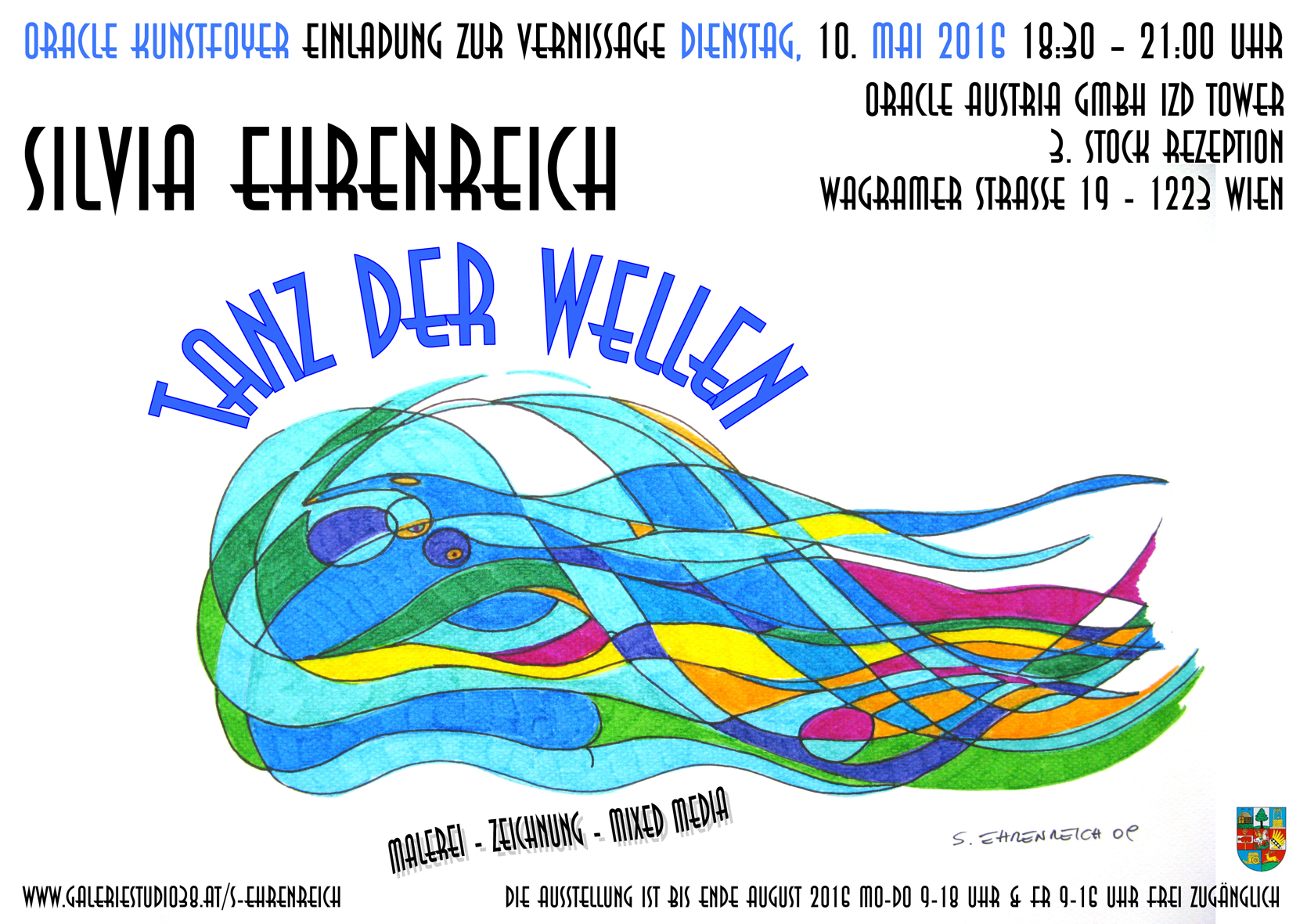 Unter dem Titel „Tanz der Wellen“ zeigt Silvia Ehrenreich im „Kunstfoyer“ von Oracle Austria GmbH im hauseigenen Kunden- und Schulungsbereich vorrangig einen Querschnitt ihrer Bilder zum Thema „Wasser, Bewegung und Tanz“ aus verschiedenen Werkzyklen und Schaffensperioden. Es werden auch ihre neuen Arbeiten zu sehen sein. Aktuell sind es Schüttbilder, mit denen sich die überaus vielseitige Künstlerin seit heuer auseinandersetzt. Ihrem Lebensmotto entsprechend: „Bewegung ist Leben – Leben ist Bewegung“ probiert Silvia Ehrenreich leidenschaftlich gerne immer wieder Neues aus, da weder körperlicher noch geistiger „Stillstand“ ihrem Naturell entspricht. „Es geht um Bewegung“, sagt sie, wenn man sie auf die Intention ihres künstlerischen Schaffens anspricht.
