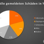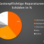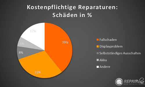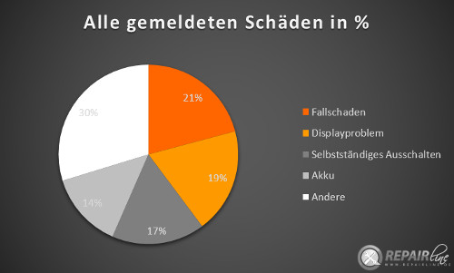 Lässt man Garantie-, Gewährleistung- und Kulanzfälle außer Acht, gehen die Zahlen deutlich auseinander. Kunden wurden mit Abstand aufgrund von Sturzschäden (42% der gemeldeten Defekte) und Displayproblemen (31%) zur Kasse gebeten. Kostenpflichtige Reparaturen infolge von z.B. Akkudefekten und unkontrolliertem Ausschalten blieben unter der 10%-Marke.