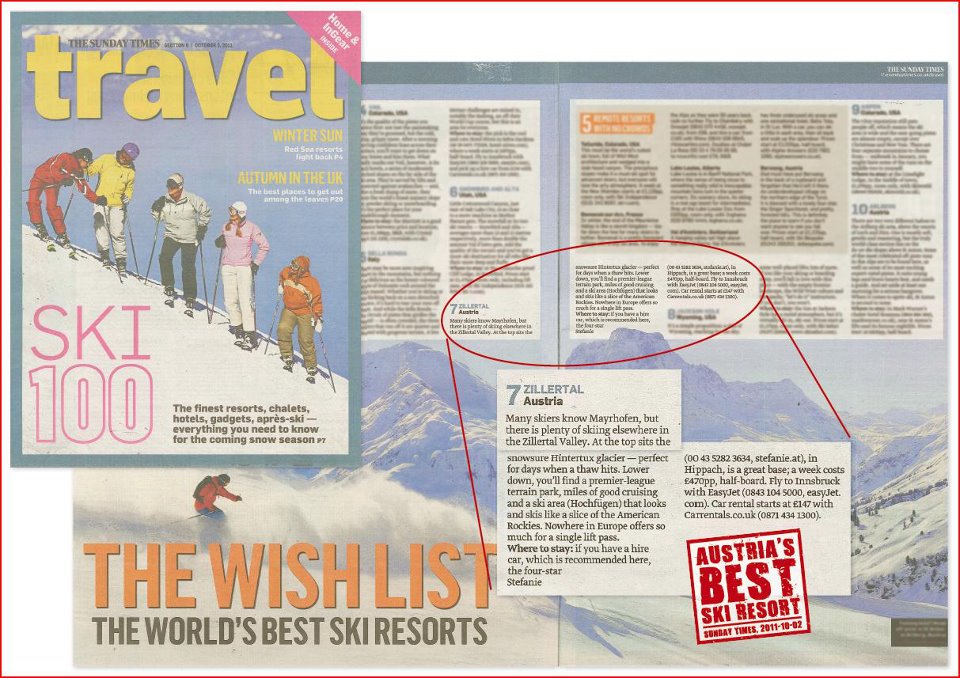 In der aktuellen Ausgabe der Sunday Times – Travel Magazine wird wieder Erfreuliches berichtet: Die Engländer erfreuen sich am Skigebiet Hochfügen.