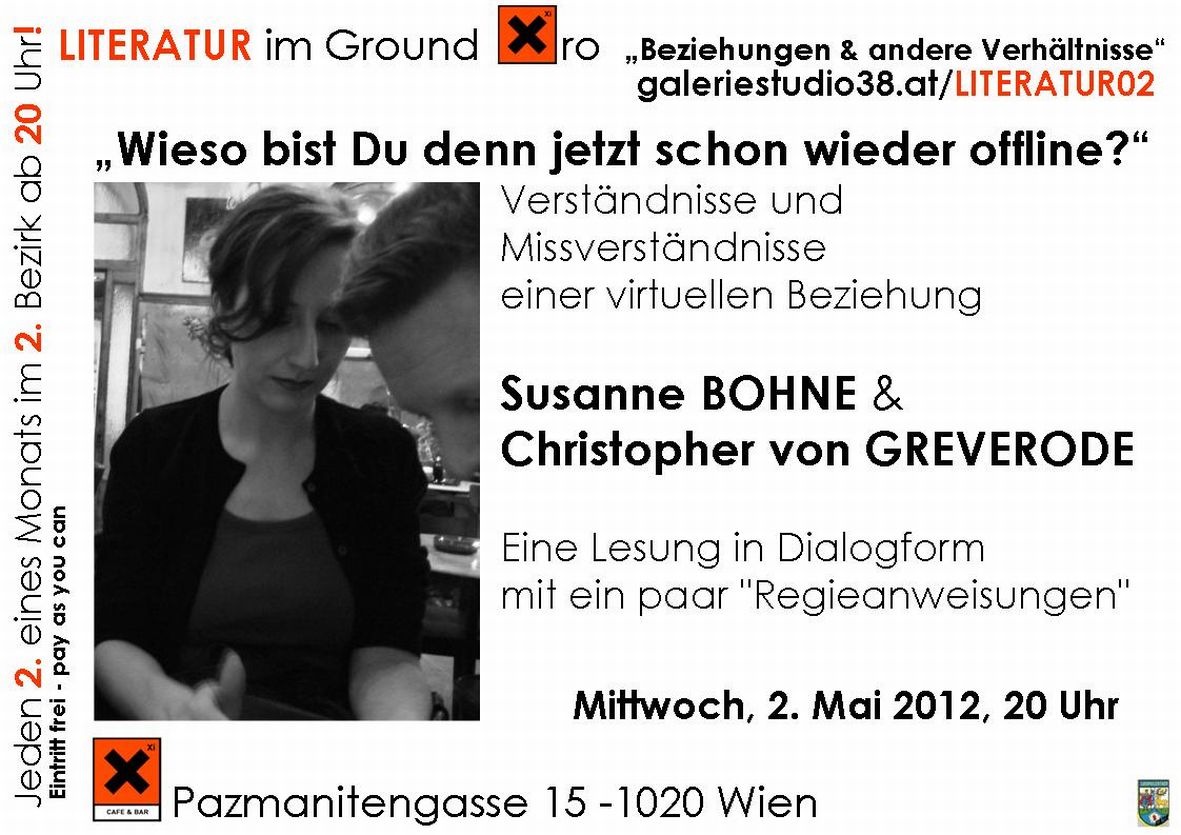Im Rahmen der Reihe „Literatur im Ground Xiro“, die 2012 unter dem Jahresthema „Beziehungen“ steht, lesen Susanne Bohne und Christopher von Greverode am 2. Mai eigene Texte zu den Tücken und Komplikationen einer virtuellen Fernbeziehung zwischen Bochum und Wien.