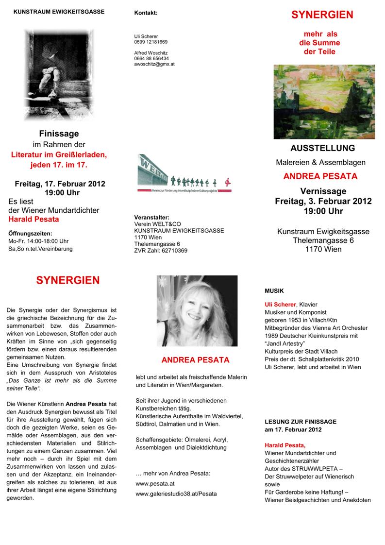 Ab 3. Februar zeigt die Wiener Künstlerin Andrea Pesata in einer Einzelausstellung ihre schöpferische Bandbreite, begleitet durch den Musiker Uli Scherer und ihren Mann, den Wiener Mundartdichter Harald Pesata.