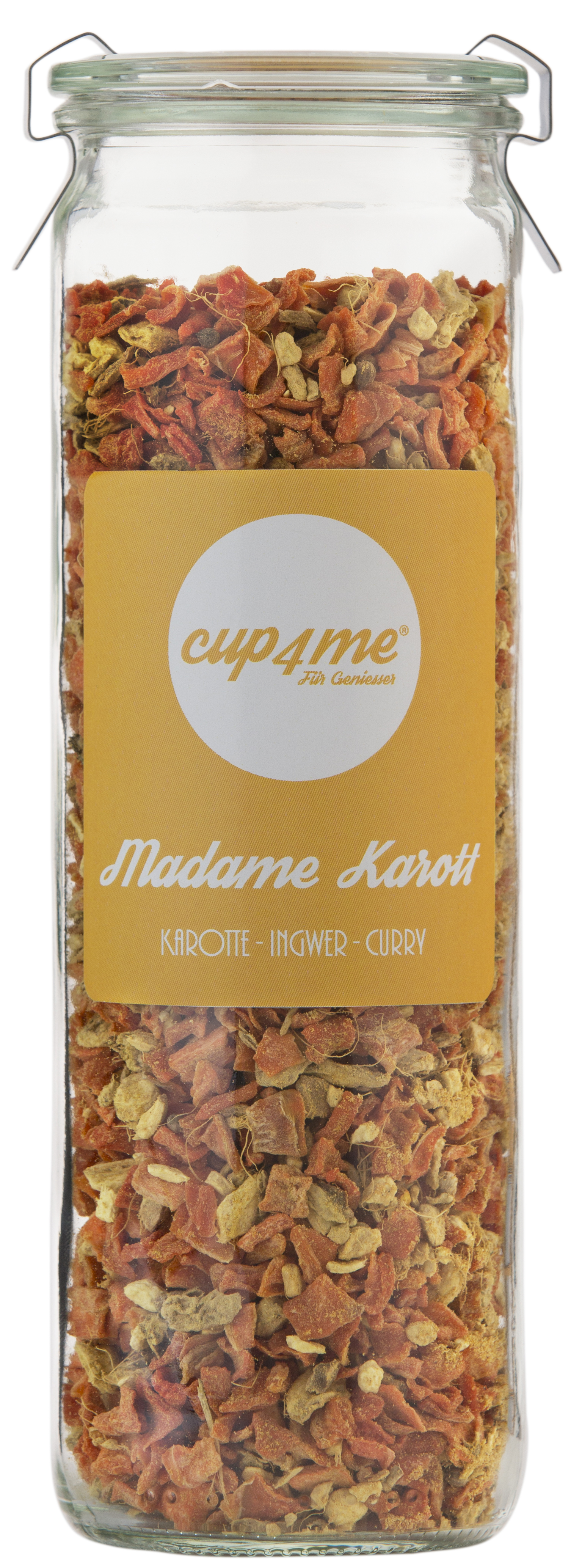 Diese Karotten-Ingwer-Mischung hat es in sich. Nicht nur der gute Geschmack zeichnet sie aus. cup4me® Madame Karott – der Booster für Immunsystem und Verdauung. Unter dem Motto: gesunde Knollen mit großem Geschmack. Ob Madame Karott auch aphrodisierende Wirkung hat? Keine Ahnung – da aber Ingwer darin enthalten ist, kann das ja sehr gut sein.
