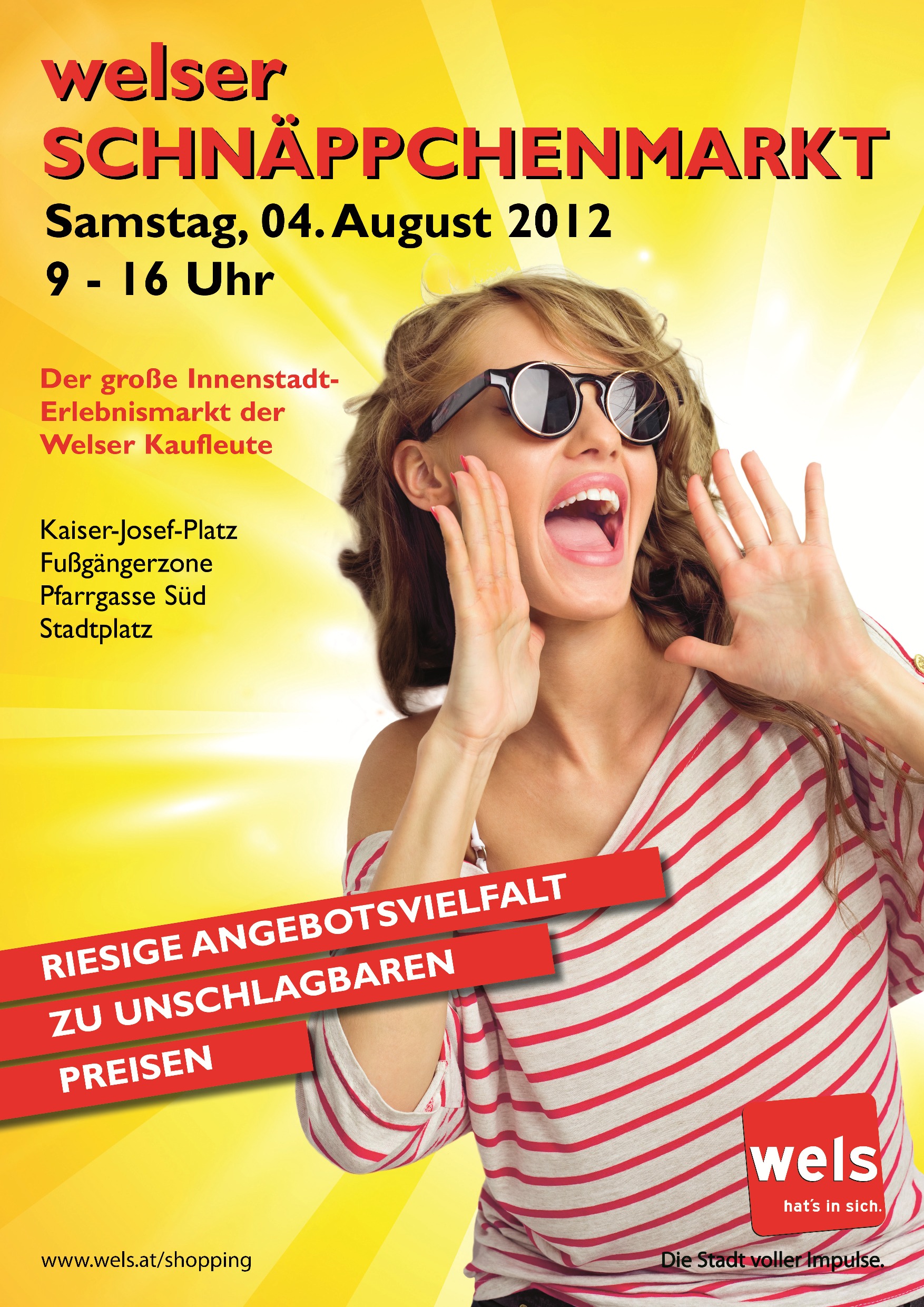 Sommer-Schnäppchenmarkt, das bedeutet rund 70 gut bestückte Marktstände mit aktueller Markenware zu Sensationspreisen und somit tausende tolle Angebote in der Welser Innenstadt. Einen Einkaufssamstag lang, von 9 bis 16 Uhr nehmen die Welser Kaufleute am Kaiser-Josef-Platz, in der Pfarrgasse Süd, der Fußgängerzone und am Stadtplatz Aufstellung, um preisbewussten Shoppingfans mehr für ihr Geld anzubieten. Modische Designerteile aus der aktuellen Sommerkollektion warten ebenso auf Schnäppchenjäger mit dem Blick für das Außergewöhnliche, wie trendige Taschen, schicke Schuhe, lesenswerte Bücher, schöner Schmuck und vieles mehr. Bei dem tollen Angebot wird garantiert jeder fündig, denn die prall gefüllte Shoppingmeile bietet Schnäppchen für Jung und Alt, Klein und Groß und das garantiert zu unverschämt guten Preisen.