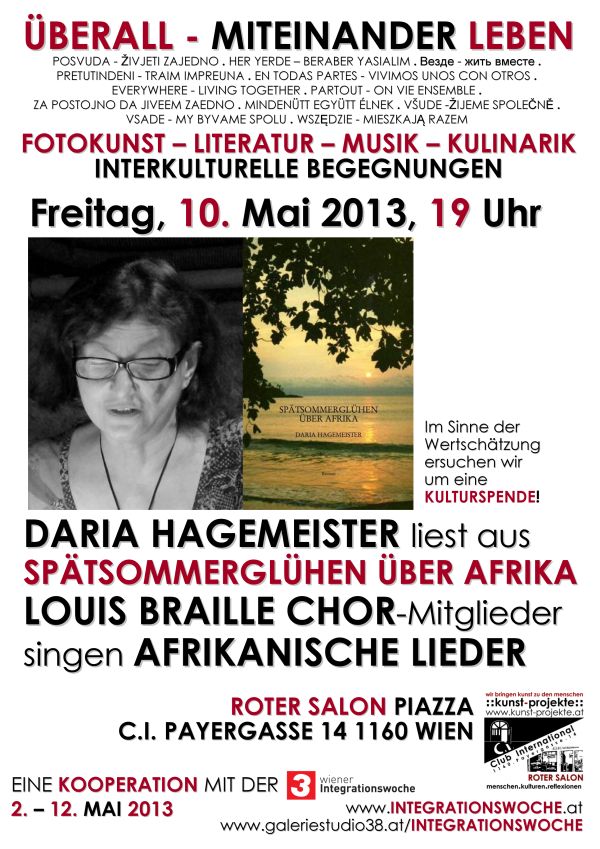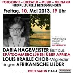 Am 10. Mai führt Daria Hagemeister in einer „multimedialen“ Lesung aus ihrem Roman „Spätsommerglühen über Afrika“ (2012, Eigenverlag – überarbeitete Neuauflage des Romans "Mein Afrika", Arovell Verlag 2008) das Publikum kreuz und quer durch den schwarzen Kontinent, durch Tansania, São Tomé, Nigeria, Simbabwe, Südafrika, Mosambik und die Kap Verdischen Inseln. Mitglieder des Louis Braille Chores sorgen mit afrikanischen Liedern für das musikalische Rahmenprogramm. Der Louis Braille Chor, den Daria Hagemeister leitet, ist ein Integrationschor in zweifacher Hinsicht: Einerseits vereint er Sänger und Sängerinnen verschiedener Nationen und Sprachen, andererseits Blinde oder schwer Sehbehinderte und Sehende.