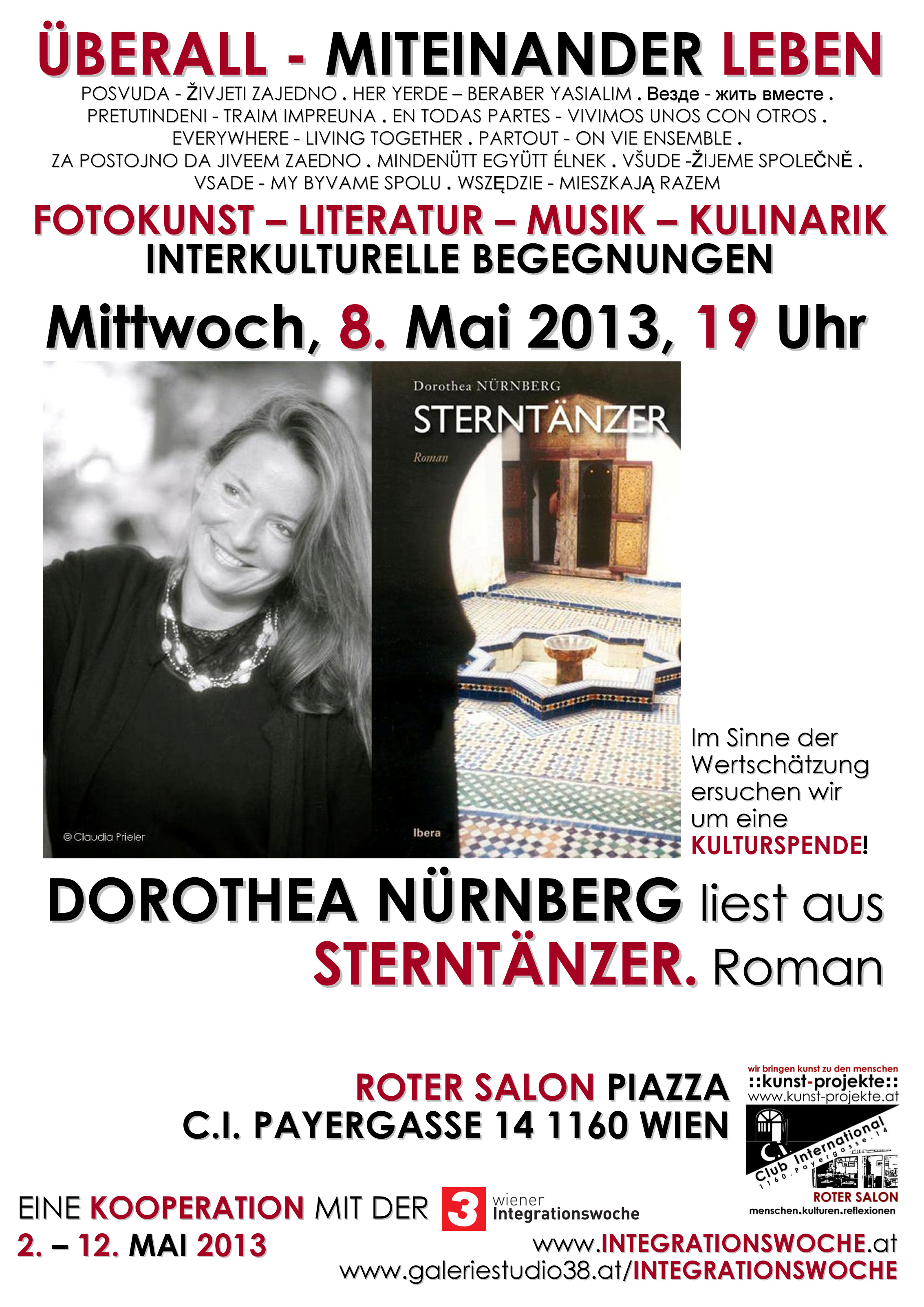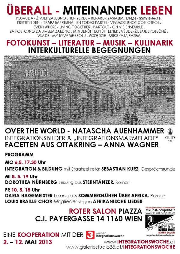 kunst-projekte und C.I. bei der 3. Wiener Integrationswoche von BUM Media 2. – 12. Mai 2013 täglich 10-2 Uhr im C.I. und 12-23 Uhr im Roten Salon Roter Salon, Piazza ggü. C.I. Payergasse 14, 1160 Wien
