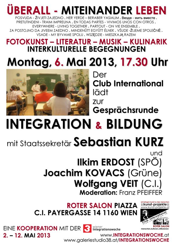 Am 6. Mai wird in einer Gesprächsrunde mit dem Staatssekretär für Integration, Sebastian Kurz zu Integration und Bildung, der Fokussierung der öffentlichen Diskussion auf Fragen der Zuwanderung Rechnung getragen. Ilkim Erdost (Leiterin der VHS Ottakring), Joachim Kovacs (Klubvorsitzender der Grünen, Ottakring) und Wolfgang Veit (Leiter des C.I.) beteiligen sich an dem Gespräch.